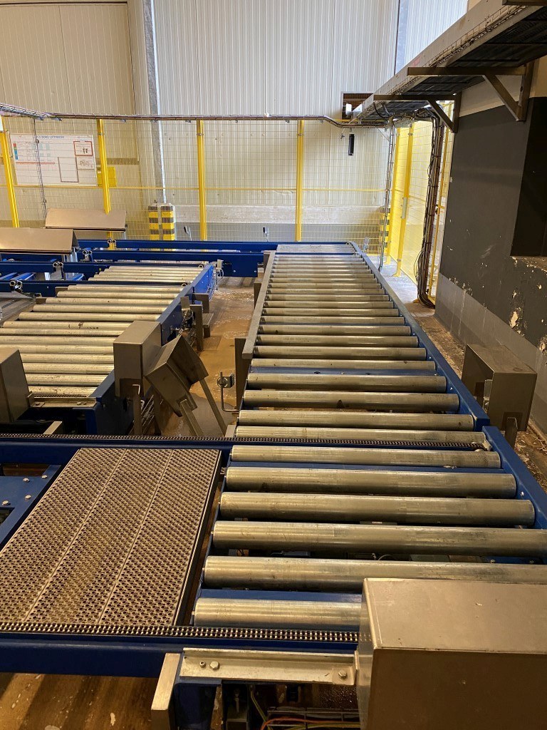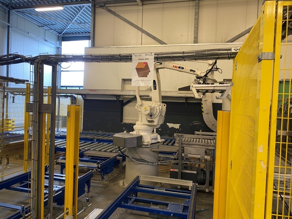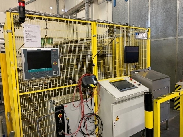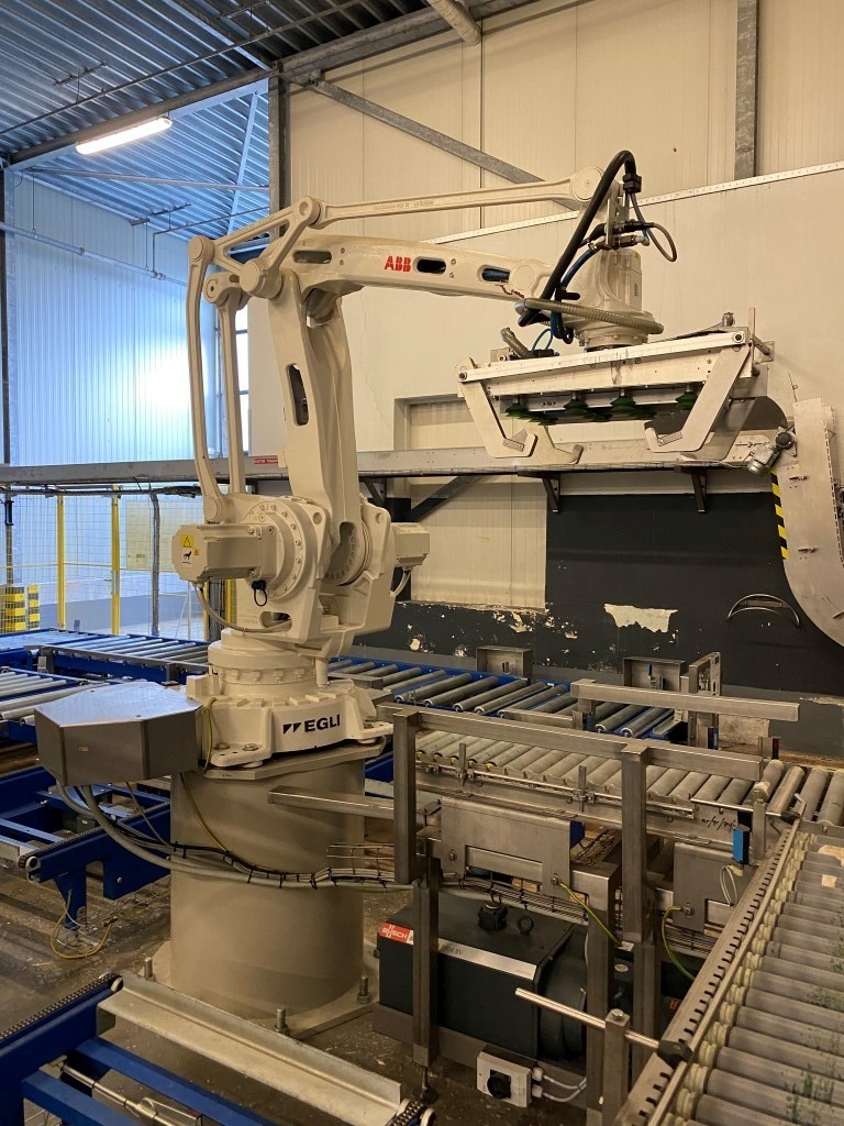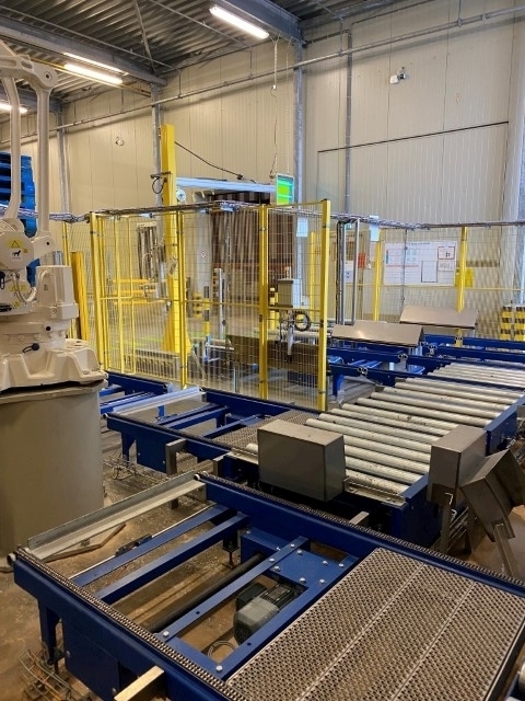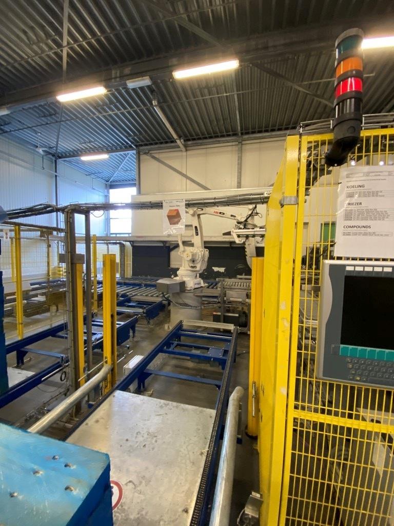 Robot used for de-palletizing cold butter bulk blocks. With a capacity of ca. 320 cartons of 25 kg. The ABB robot accurately positions carton boxes from the pallet onto the infeed conveyor of the de-boxer. The deboxing packer also available under STN15963. The pallet transport system includes an infeed conveyor for wooden pallets, a separate conveyor for empty pallets, a depalletizing station, a pallet stacking station and a removal station for stacked pallets. The robot with conveyors has complete safety covering. Controls: Siemens S7 with operation panel. The empty boxes are transported via the conveyors outside the unit.