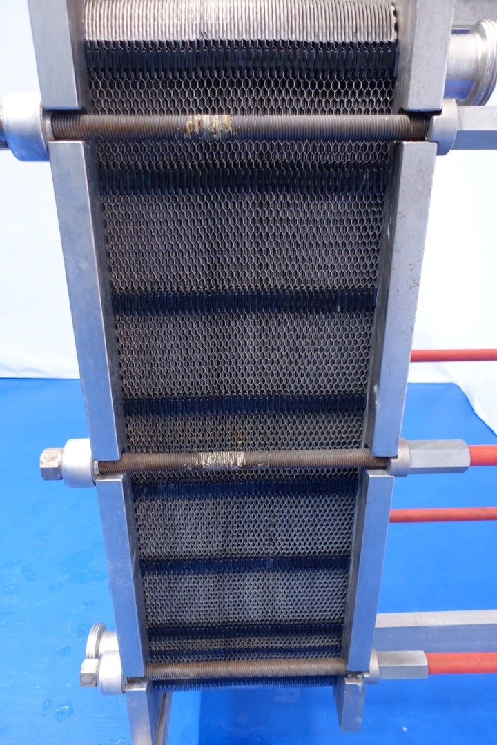 Plate heat exchanger, sanitary (PHE). Pressure: 16,0 bar, Beam length: 120 cm, connections: 4x3" DIN. Current configuration: 1 sections: 81 plates. Design temperature 0/120 °C. - Connections head: 2 down, follower 2 up. Heating/cooling surface per plate 0,38 m2 per plate total 30,8 m2. Volume, side 1: 57,6 ltr + side 2: 59,0 ltr Total dimensions: 138x67x183 (lxwxh) cm - weight: 810 kg.