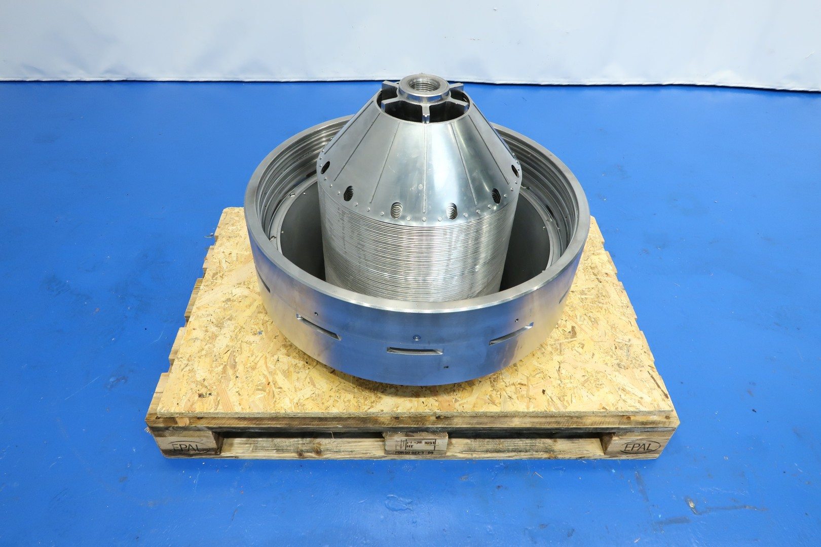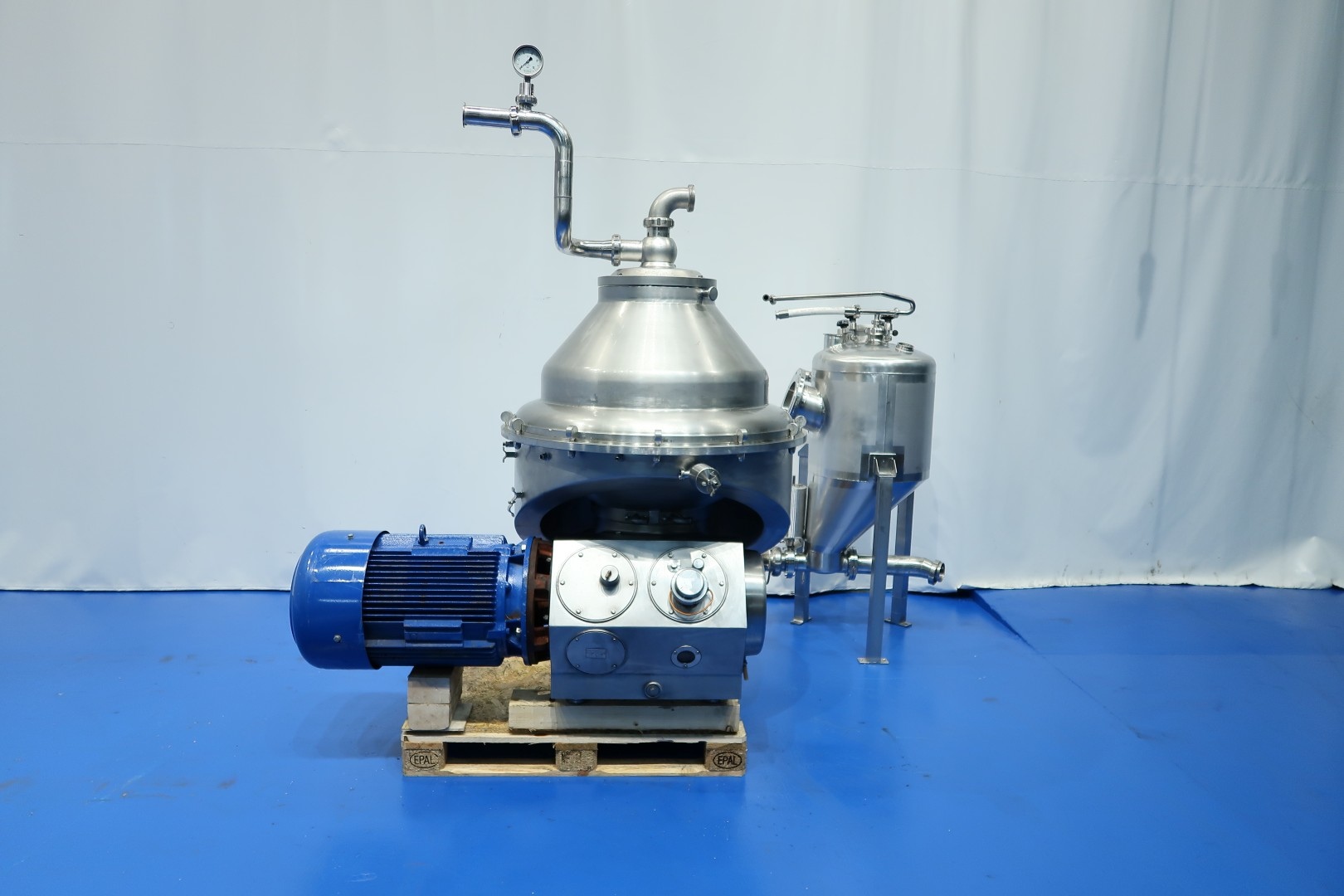 Fresh cheese - Quark - Greek Yoghurt -Skirr -Labaneh separator, Self cleaning nozzle separator with 12 nozzles. Capacity on input 5,000 up to 9,000ltr/h, Capacity depending on Protein content on inlet and desired total solids on outlet up to 3,000kg product out (max 20% ts). The separator concentrates fermented skimmilk in a ratio of approx 2,2/3ltr input to 1ltr concentrate on output. Bowl speed 4,160rpm, sludge space: 25ltr in bowl. Including quark collecting tank, a Funnel volume: 195 ltr, with 2 x level sensor and 1 x temperature sensor. Skid with watermodules (OWM). Motor 37,0 kW. Set of tools (list available) with ring key and pressing tool. With big set of spare parts, including 1 x extra impellor Pump and 1 x main spindle. Documentaion: Instruction book and parts list available (in English and German). Excluding: Baseframe, double filter and controls. Dimensions separator: 200x175x205 (lxwxh) cm - weight: 1.459 kg. Total weight all parts: 2.705 kg.