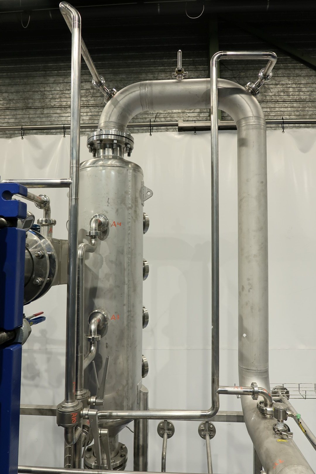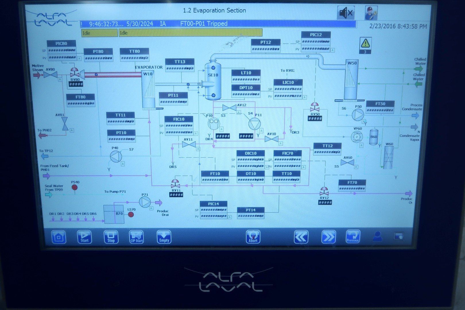 Pilot Alfa Laval evaporation system for concentrating feed from 12% to 65% (dry solids by weight percentage). Unit has a 1-effect evaporation system driven by motive steam. Product In: flow rate 200 kg/hr - pressure 1,5 barA - temperature 15 °C - concentrate 12%. Product out: flow rate 37 kg/hr - pressure 2 barA - temperature 63°C - concentrate 65%. Main equipment: Effect- PHE, Condensor PHE, Preheater PHE-Feed, Preheater-Water, Cyclone separator for Effect-1, Feed pump, Water loop pump, Effect-I reciruclation pump 1, Effect-I recirculation pump 2, Effect-1 condensate pump, Condenser condensate pump, drain pump and vacuum pump. Drawing no. 9661468089. State of the machine: Excellent. Documentation digitally available: Electrical diagrams, Technical documentation, PID, Component drawings, Installation and Operation Manual. Originally built for R&D factory, newly built and prepared for operation. However, never proactively used for (test) production. Unit can be used for: proces development and optimalisation, testing before industrial scale-up, testing new products or compositions, R&D, econom and technical feasibility study. With SS frame with 23 spare plate heat exchanger plates. Currently in our warehouse. Total dimensions: 590x355x467 (lxwxh) cm - weight: 5.290 kg.