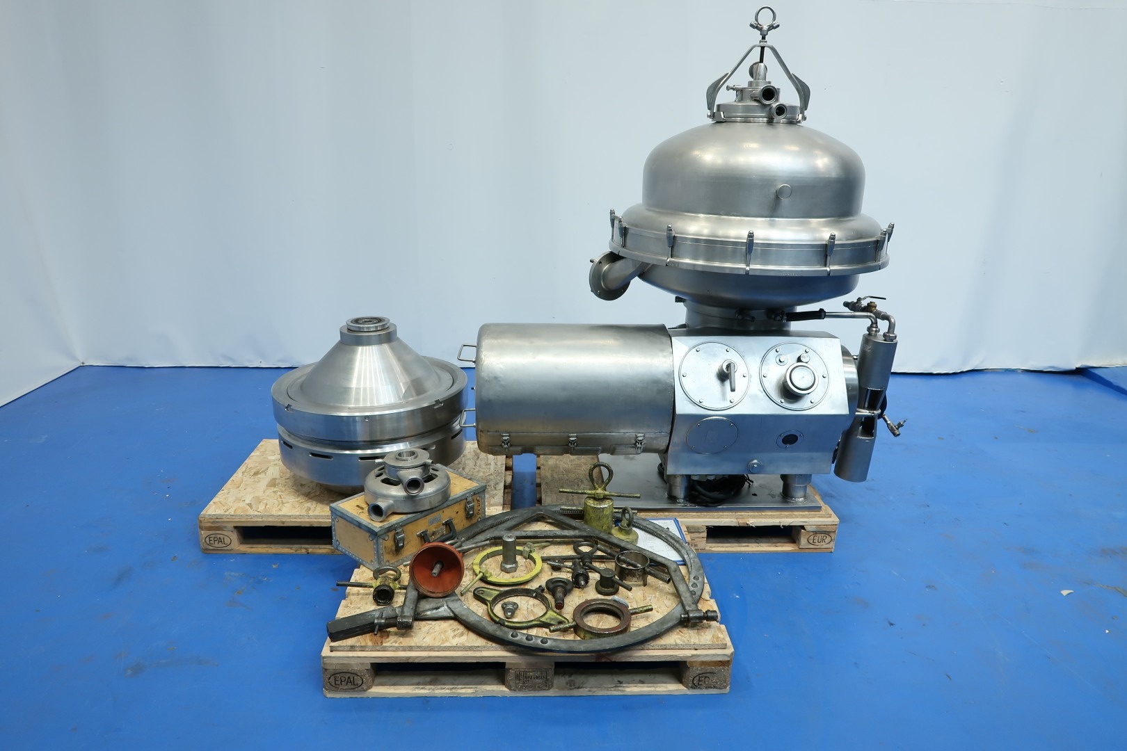 Separator, 3 way separator, for high fat/oil dehumidification like butter oil, self cleaning. Including bowl, motor cover, base frame, OWM. Motor 30,0 kW - 56 A - 1.440 rpm - 50 Hz. This is a 3 way separator, 1 in and 3 out . Inlet bottom fed (hermetic design), out in top, light clean oil and heavy fase can be water with additives and sludge (heavy particles). Bowl design and discharge The bowl of the SRPX 317 HGV-74 is configured as a concentrator, enabling effective phase separation. The variable discharge allows the solids discharge to be flexibly adapted to specific requirements. The timed discharge optimizes operation and minimizes downtime. Outlets for liquids The machine features hermetic outlets for the light and heavy phase. This ensures clean and secure removal of the separated liquids without leakage. Set of tools with ring key and pressing tool. Without sludge collecting cylcone and controls, can be offered upon request. Dimensions: 172x92x182 (lxwxh) cm - total weight: 1.704 kg"