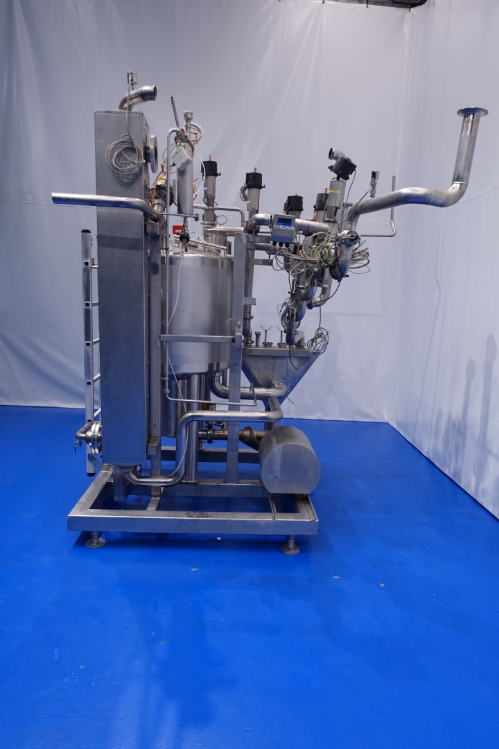 Skid mounted Cip unit, Which includes all items to make a CIP unit except the lye and acid storage tanks. included is a Balance vessel, CIP+ Centrifugal pump, Tubular heat exchanger to heat up the cleanig detergent, 2 x Siemens mag flow transmitter, valves and piping. The balance vessel, has a capacity of 500 ltr, 2 x cip spray bowl, Temp sensor and level sensor. The CIP + pump is an Alfa Laval model: LKH-20/165 centrifugal pump - 5,5 kW - 10,7 A - 2.880 rpm - impellor Ø 165 mm - Connection in: 2,5" Din - out: 2,0" Din, capacity: 25m3 up to 3,5bar or 50m3 up to 2,5bar. inline Filter and an insulated Spira flow mulittube tubular heat exchanger. The return line with conductivity transmitter and return water collecting vessel connected to side of skid for sending the return flow to the drain. Total dimensions 190x175x275 (lxwxh) cm - weight: 660 kg.
