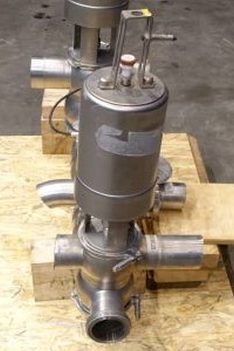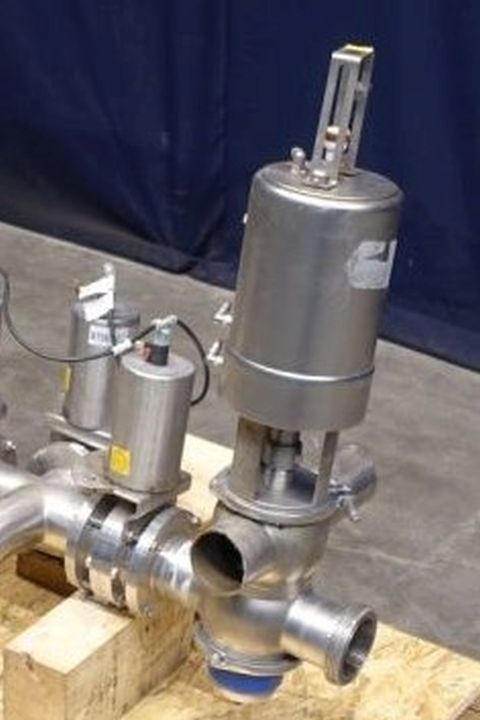 Mixproof valve with seat lift. 4-Way. Butterfly stop valve between flanges. Pneumatic activated. Diameter: 3'' Weld-Weld / 3'' Weld-SMS. Single position sensor.