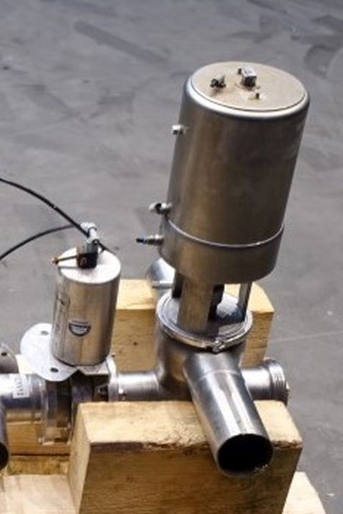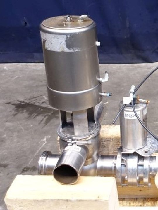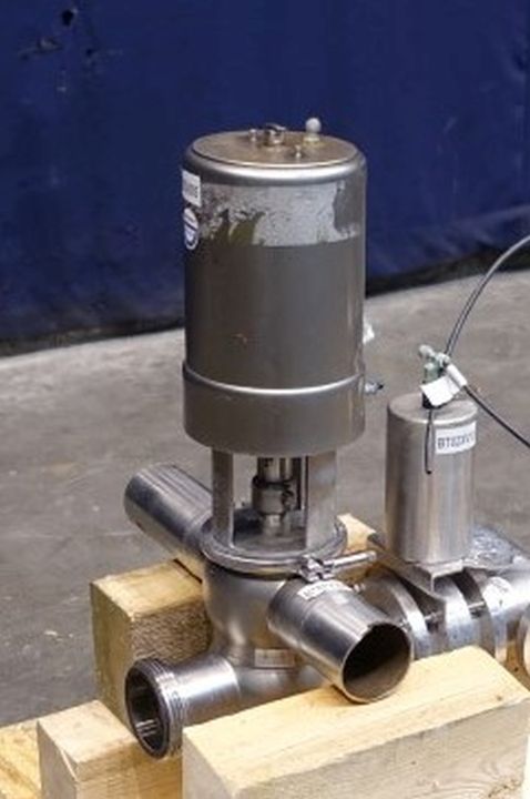 Mixproof valve with seat lift. 4-Way. Butterfly stop valve between flanges. Pneumatic activated. Diameter: 3" Weld-Weld / 3'' Weld-SMS. Single position sensors.
