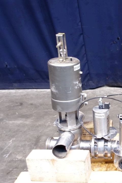 Mixproof valve with seat lift. 4-Way. Butterfly stop valve between flanges. Pneumatic activated. Diameter: 3" Weld-Weld / 3'' Weld-SMS. Single position sensors.
