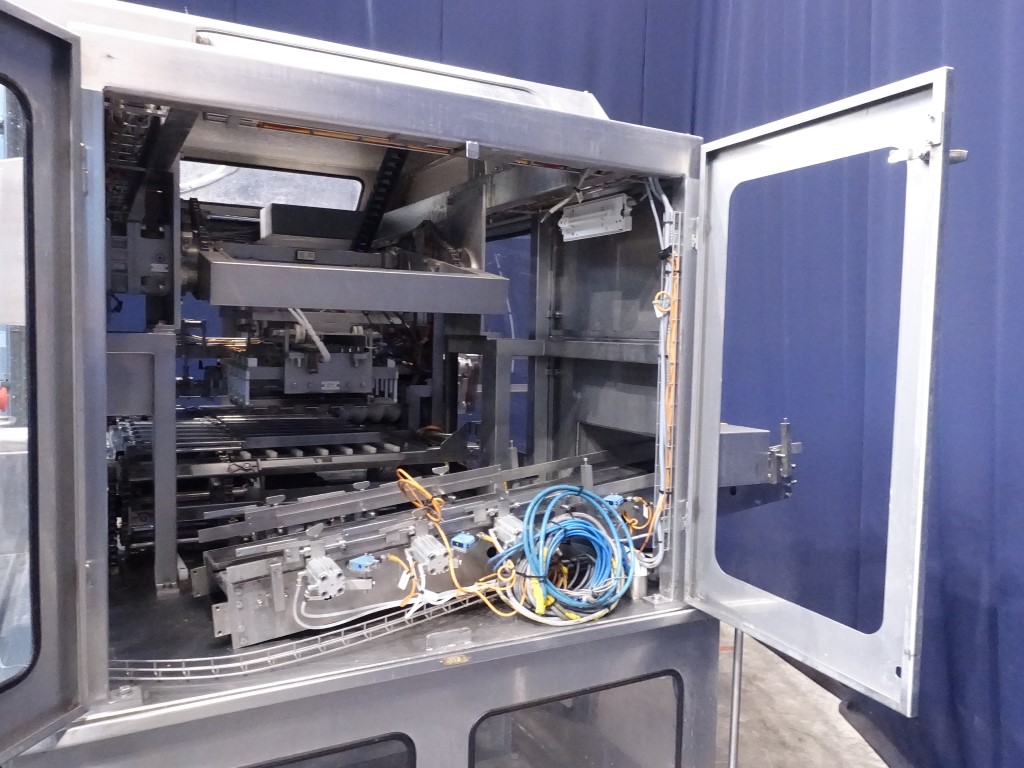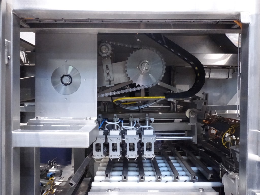 Fully automatic packer for cups into a tray. Used for cups of diameter 71 mm. Current dimensions of the tray: 47 x 33 cm. Layout of the tray 4 x 6 = 24 cups / tray or 2 trays of 12cups in same dimensions. Cup up linining with a infeed auger. Excluding control panel. In/outfeed conveyor for trays not complete. belt of cup converyor missing, Total dimensions: 250 x 250 x 240 cm.