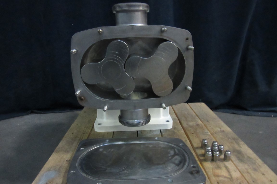 Sanitary positive displacement lobe rotary pump (without motor) for viscose products like curd / cream etc. Pump with Tri-lobe rotor of stainless steel. Connections in-/outlet 4’’. DIN11851. Maximum pressure up to 10 bar, max. 110°C. Displacement 2,92 ltr per rotation.