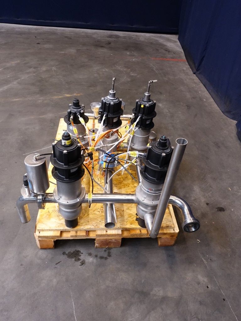 2 x DA34 2'' - 4 way mixproof double seat valves. 1 x DA34 2'' - 3 way mixproof double seat valve. 2 x D34 2'' - 4 way mixproof double seat valves. All valves welded together.