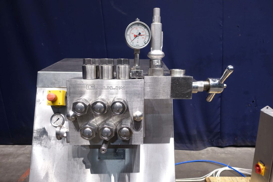 High pressure homogeniser. 1-stage with manual pressure control. 3 Pistons, piston diameter: 32 mm, Stainless steel cladded. Connections: 2x 1,5" Din. Current motor power: 7,5 Kw - 14,7A. and oil circulation pump 0,37kW. Maximum pressure in current confirguration with this motor to 250 bar. Freestanding control panel. Overpressure valve (336bar). Manometer on highest perssure. Total dimensions: 100 x 95 x 145 cm, weigth: 770 kg.