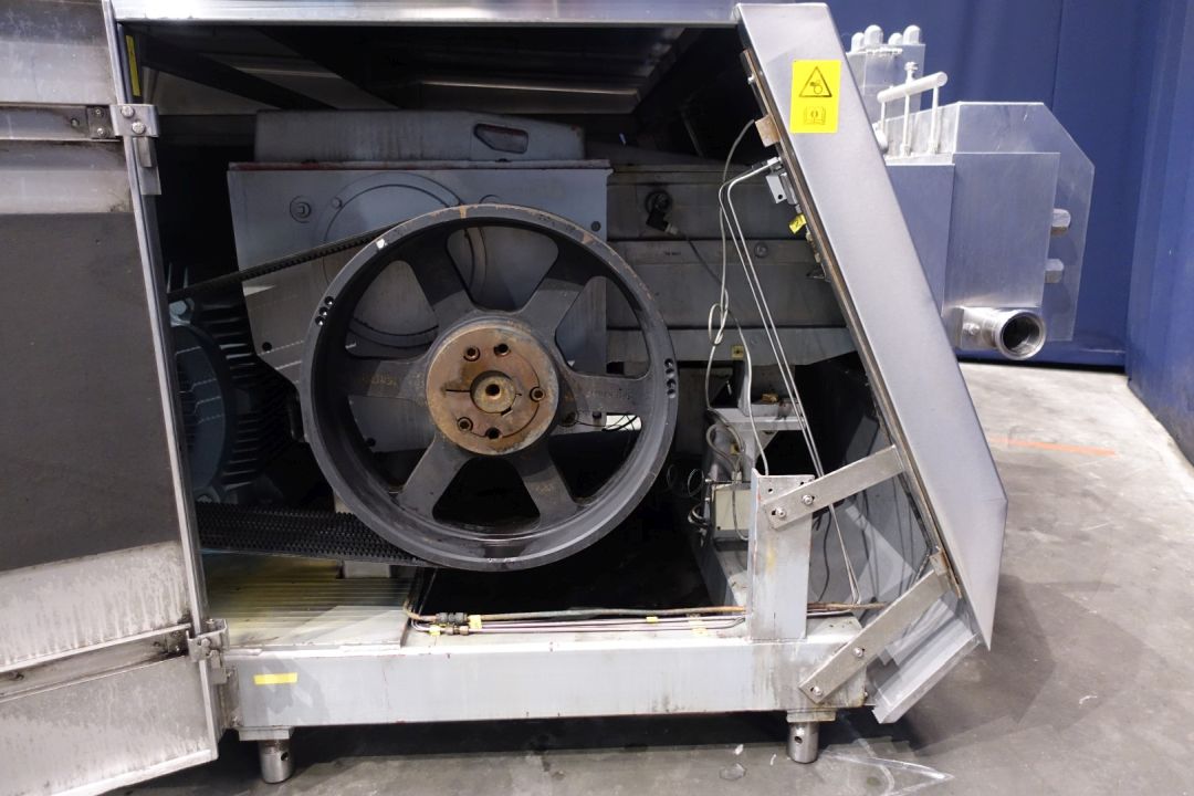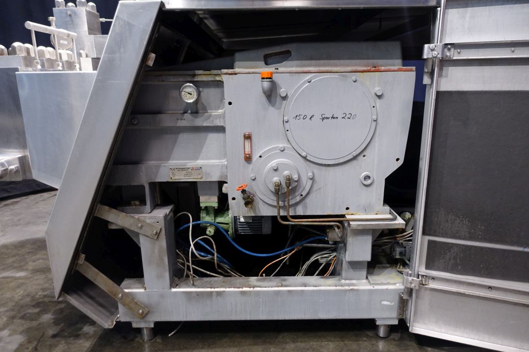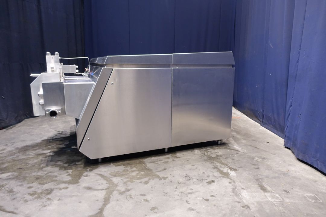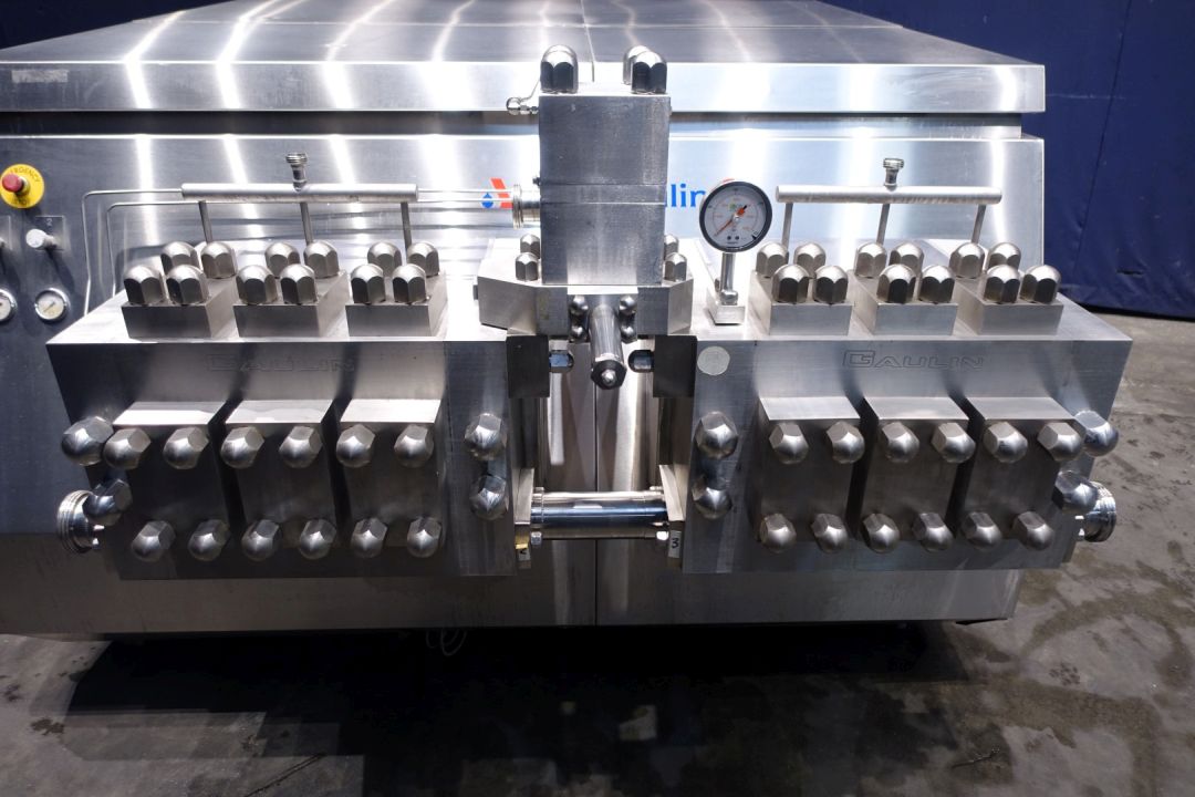 APV Gaulin 200-3P homogenizer. 2 Stage, hydraulic pressure control. 6 Pistons, piston Ø 60 mm. Current motor power: 200 kW and maximum pressure in current confirguration with this motor 210 bar. Two sides product inlet 2 x 3" Din, overpressure valve. Other connections 1 x 2" Din and 2 x 1" Din. Max. temperature: 80°C. homogenization valve 80 mm Piloted. Oil circulation pump and cooler, and hydraulic module or pressure control. Total dimensions: 300 x 240 x 165 cm. Weight: ± 7.600 kg. manual in German. Excluding control panel.