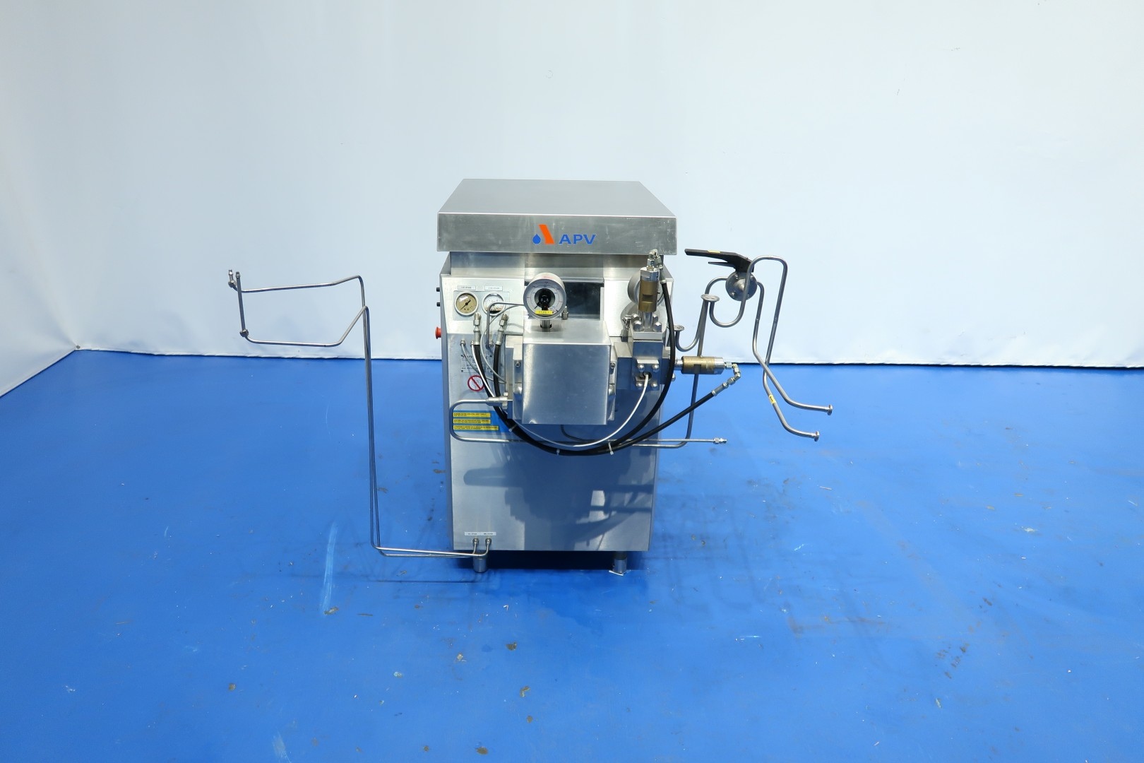 High pressure laboratorium homogeniser. 2 Stages with hydraulic pressure control. Ball valves for viscose products, 3 Pistons, piston diameter: 18 mm and stroke: 38mm. Connections: 1" Clamp. Motor power: 5,5 kW and maximum pressure in current confirguration with this motor up to 400 bar (5,800psi). oil circulation pump Built in control panel. with manual bypass valve. Manometer.Flowswitch on cooling water. Total dimensions: 144x113x143 (lxwxh) cm - weight: 482 kg.