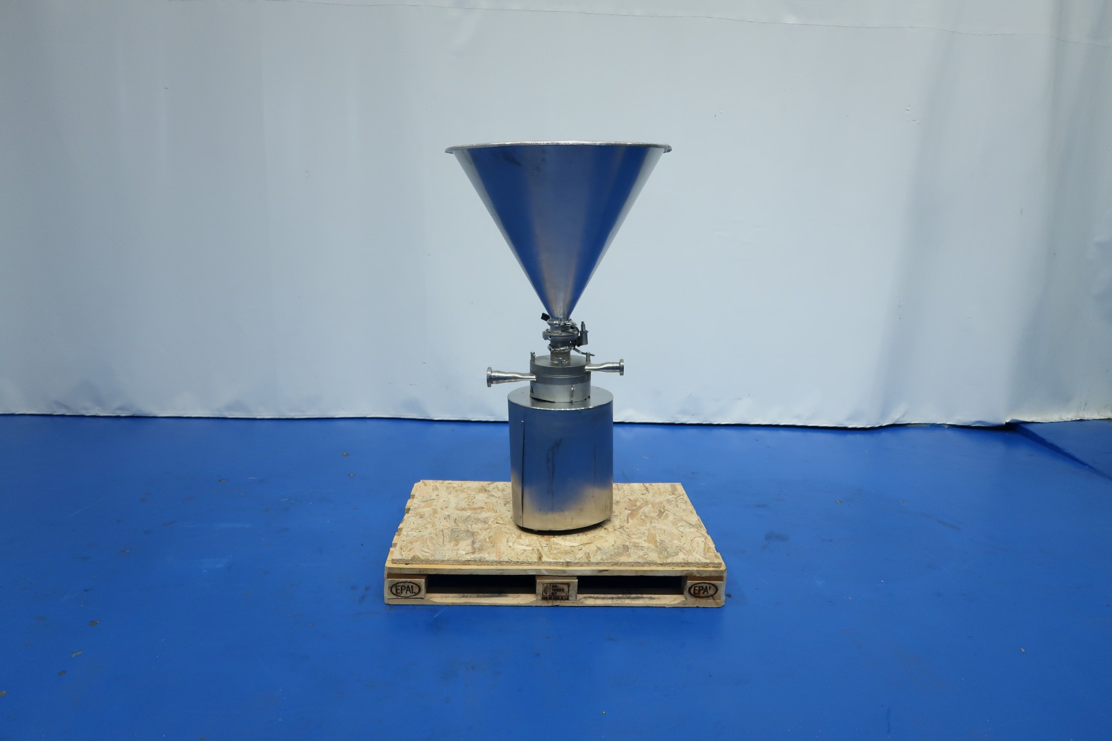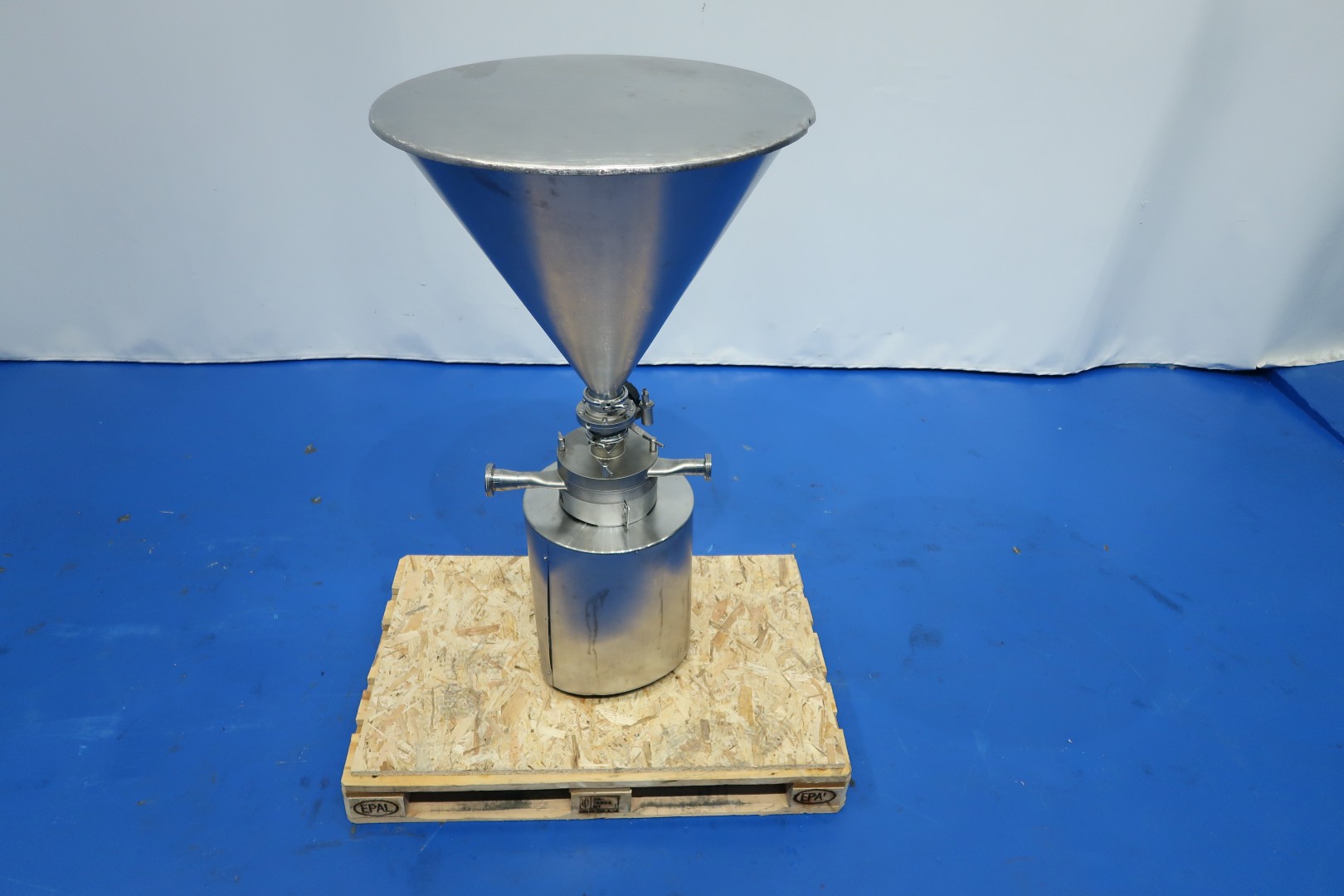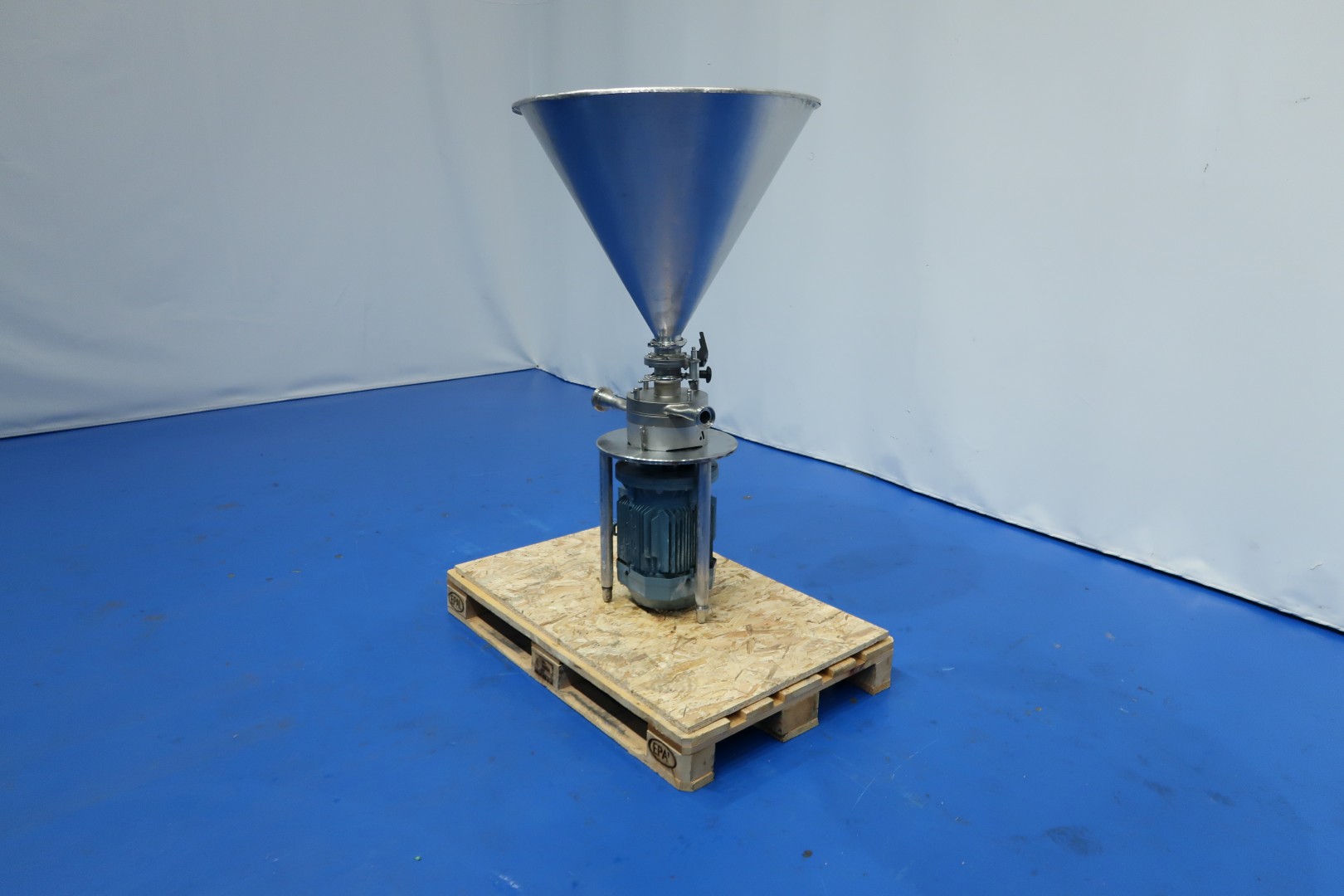 Powder dissolver with hopper with cover. Hopper volume ca. 100 liter. Order no. 27150591. Impellor size 170 mm. Motor: 7,5 kW - 13,9 rpm, 50 Hz - 2.915 rpm. With manual butterfly valve on infeed under hopper. The powder mixer can be used in any situation where powder is first added and then dissolved in liquid. Milk powder: 60 kg/min, whey powder: 75 kg/min, lactose: 150 kg/min and sugar: 130 kg/min. Connections: (in) 2" Din - (out) 1,5" Din. Dimensions: 80x80x140 (lxwxh) cm - weight: 120 kg.