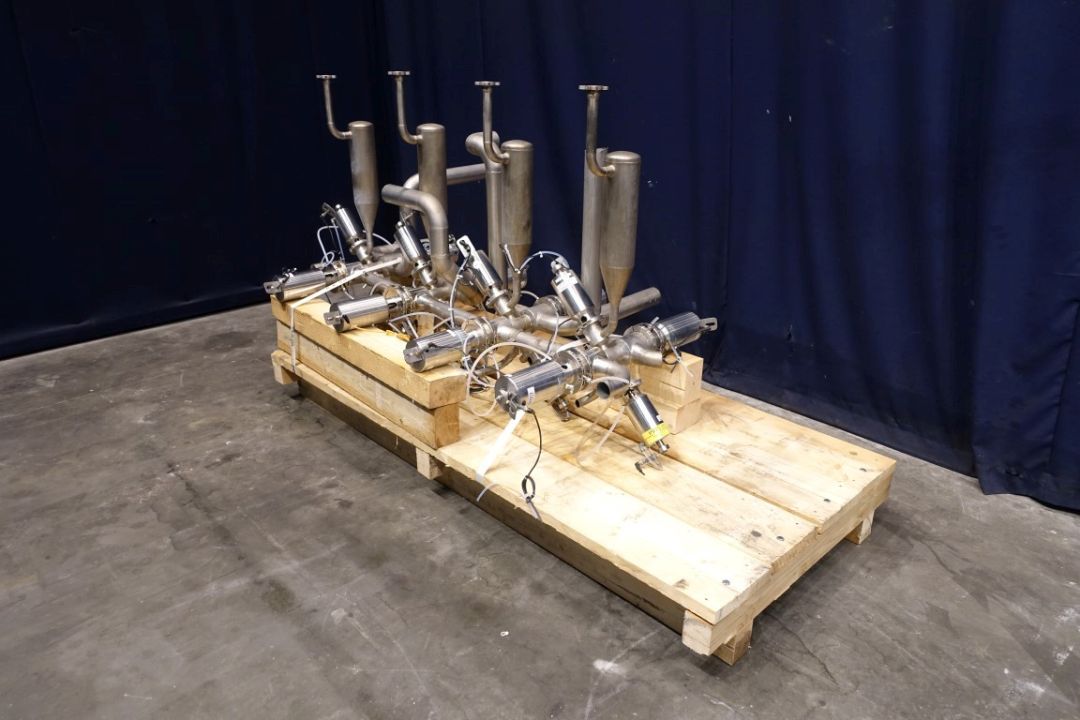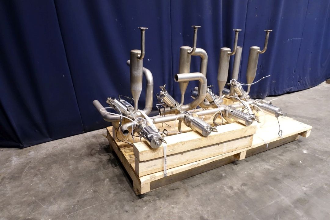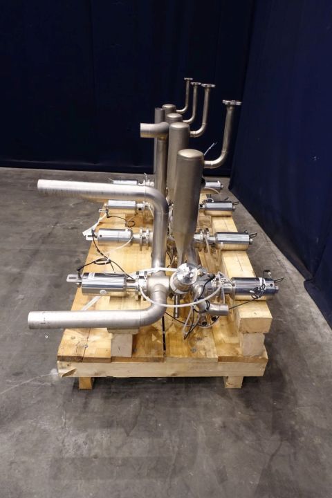 Set of aseptic valves (valve cluster). Connections DN65, 4 lines are connected in aseptic way to a pipeline to connect 4 lines to 1 line 8x DN80 aseptomag valves. 4 x 2 valves for steam in and condensate out to create a steam lock, the asptomag valves also have a chamber to be able to flush peroxide, 4 condensate collecting tanks (if valve closed) on steam inlet pipe. Total dimensions 180 x 110 x 135 cm.
