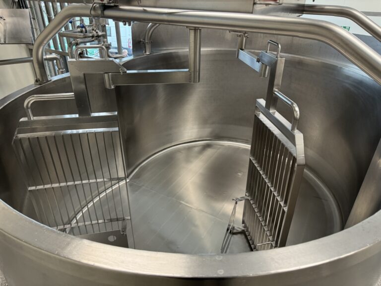 Complete production line for semi hard cheeses like Gouda, Maasdam Edam. Line was primarily used for demonstrations, so still in excellent condition. Controls: Siemens S7 and color touchscreen HMI operation panel. Cheese shape and Weight, round ‘Wheel’ shape: 4–5 kg and 10–12 kg. Batch size: 4.000liter. Daily capacity: 2 batches (8.000 liter) in a 1 shift or up to 4 batches (16.000 liter) in 2 shifts. Main components: 1.) Raw milk reception (tanks excluded), 2.) Milk pasteuriser, 3.) Cheese vat (4.000 ltr), 4.) Prepressing vat, 5.) Final Presses, 6.) CIP-system, 7.) Brine system, 8.) Mould cleaning, 9.) Cheese ripening racks, 10.) Set of moulds and 11.) Controls.