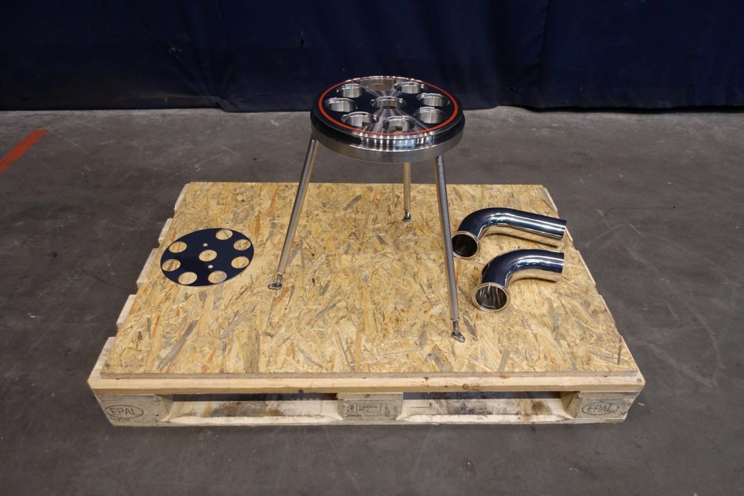 Vertical filter housing, unused, in original packaging. Including insert with a diameter of 56,22 mm. Diameter on top 270 mm. Length filter house 133 cm. Sanitairy for liquids. Volume: 63,9 Ltr. Connections 1x 1,5" Try clamp and 2 x pipe Ø 78 mm.Only housing, excluding filters. Dimensions: 50x50x160 (lxwxh) - 79 kg.