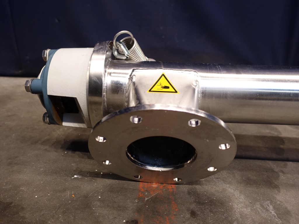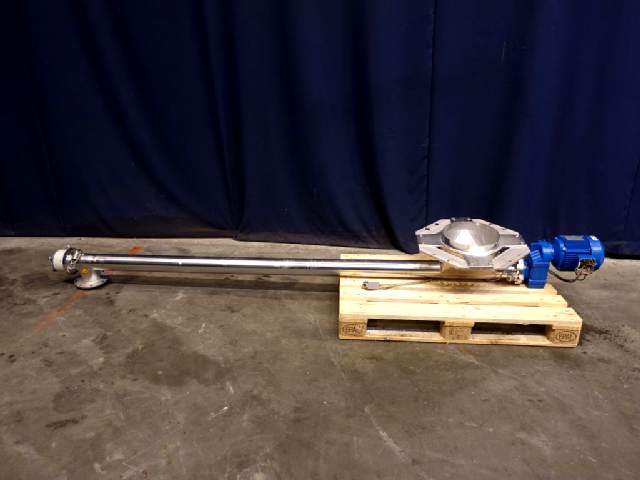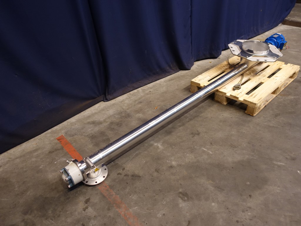 Powder transport auger. Length of auger 250 cm. Diameter auger: 10 cm. Displacement per revolution ± 9 cm length. Motor: 1,5 kW - 3,7 A - n1: 1710 rpm - n2: 100 rpm. Inlet: diameter 30 cm. Outlet diameter 10 cm flange connection.