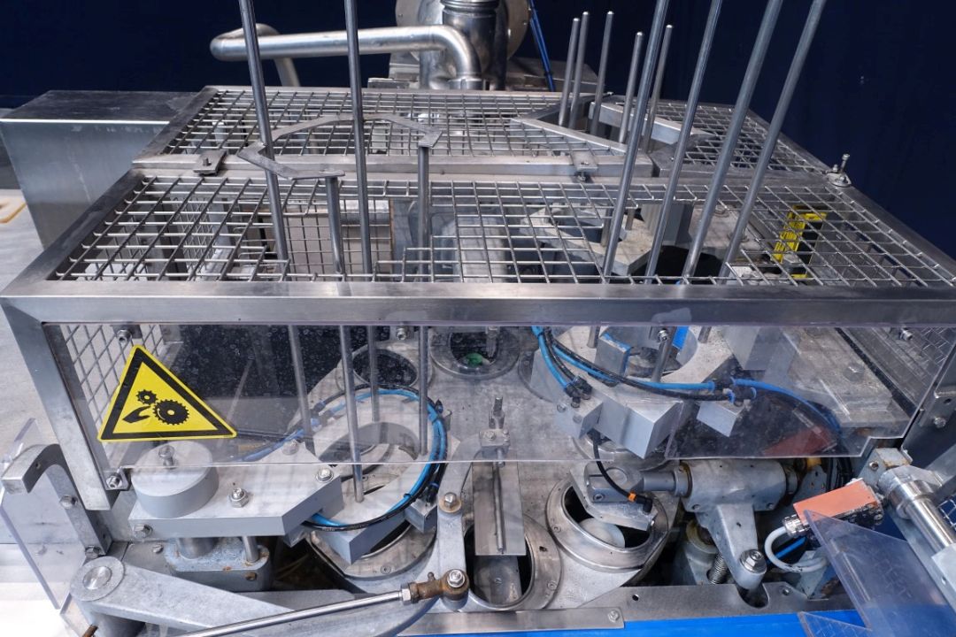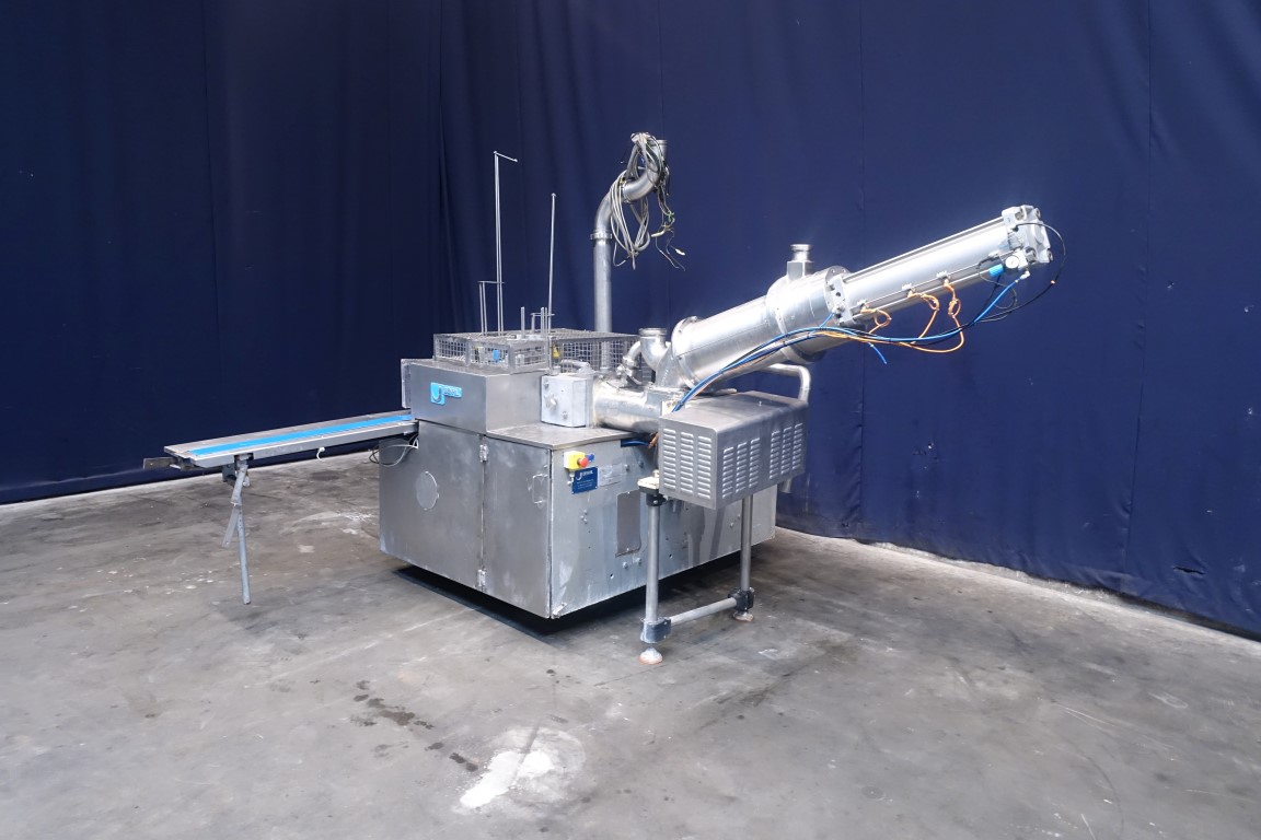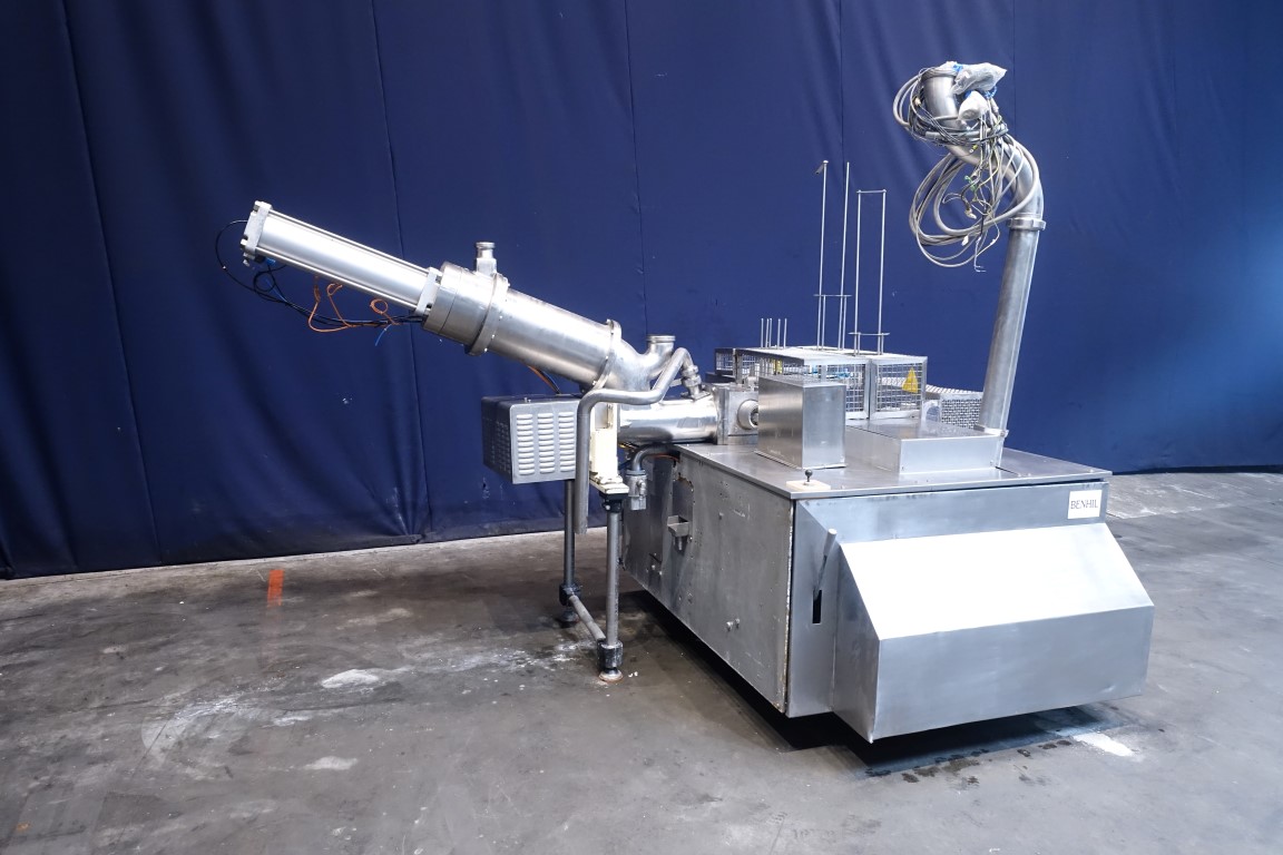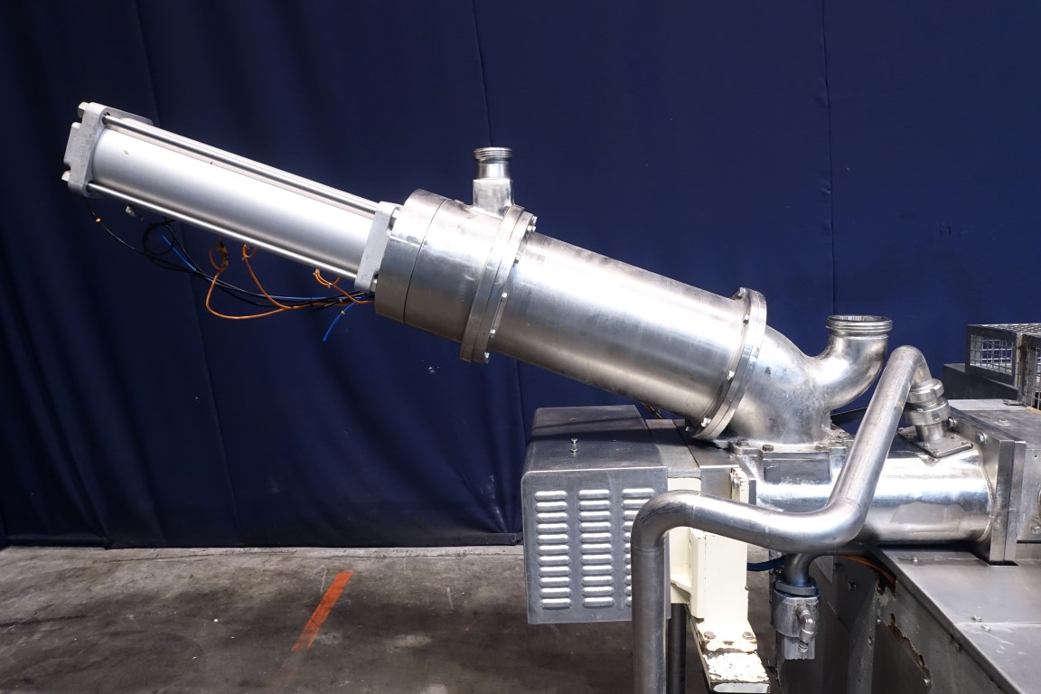 Rotatry cupfiller, 1 head specially for Butter. Cup size oval. Stations: Cup destacking, Piston doser with double screw infeed system with compensator to pump butter in and have a constant pressure (ATIA system, semi CIP cleanable), interleave paper station, snap-on lid, outfeed on single lane outfeed conveyor. Stainless steel safety guards. Semi automatic central greasing system. Controls: Siemens S7-300 and Siemens operation panel. Documentation available. Machine rebuilt by Atia in 2001. Total dimensions: 300 x 310 x 220 cm. Weight: 1.900 kg. Can be converted to sealing and different format within machine limits.