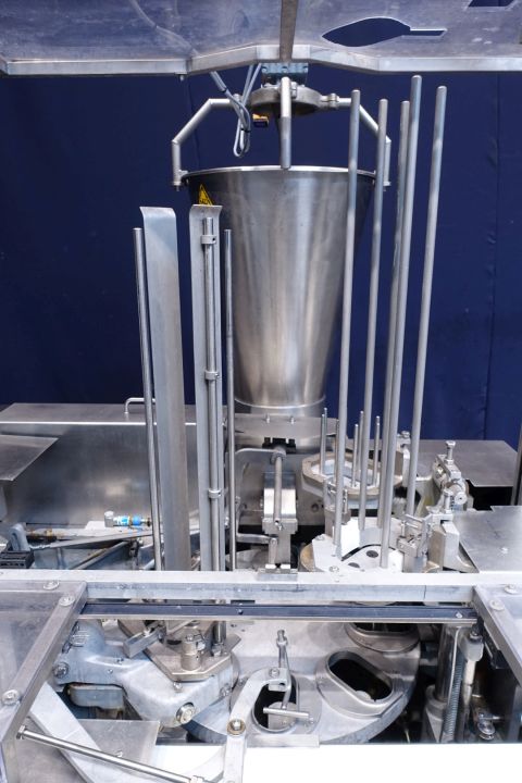 Rotatry filler, with 1 Head, 2 formats: cup size oval: 140x80 mm - cup size square: 130x95 mm. Stations: Cup destacking, double detection, Maindoser (200-250 gram) piston diameter 100 mm, Pistondoser for smooth products. with hopper, agitator (manual cleanable) - no stirrer shaft, interleave paper dispending by vacuum, push station (interleave paper direct on product) snap-on lid, outfeed on +/- 1,8 meter (width 13 cm) single lane outfeed conveyor. used on Herbbutter. Machine has plexiglas safety guards and has a manual central greasing system. 6204 production hours only. Controls: Siemens Logo! cpu and manual buttons. Electric scheme available. Total dimensions 335x170x250 cm.