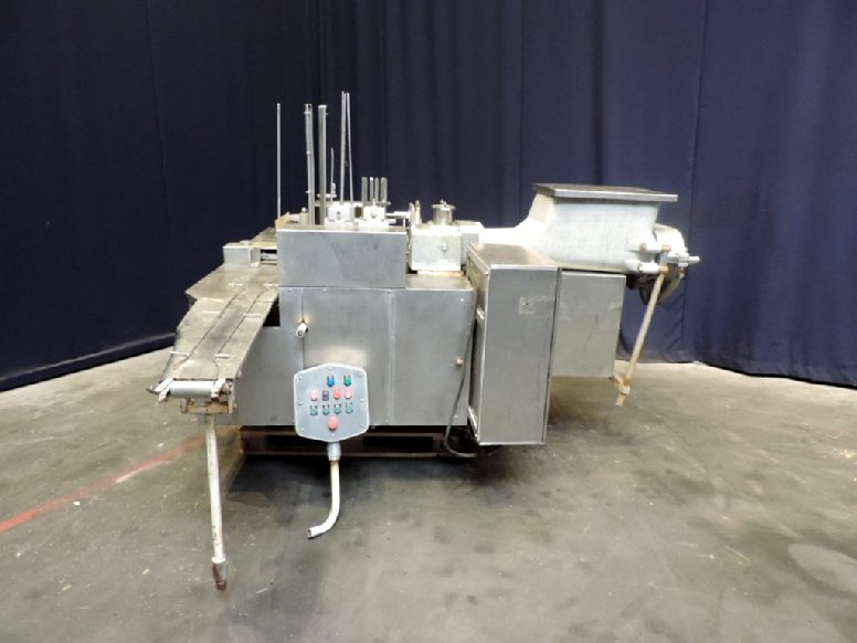 Incomplete rotary filler with 1-head for viscose products like butter or margarine. Cup size rectangular: 115 x 75 mm. Stations: cup destacking, incomplete main piston doser for viscose products (stainless steel house, volume: ± 250 ml), interleave paper dispending by vacuum, snap-on lid and outfeed on +/- 1,5 meter single lane outfeed conveyor. Feeding by aluminium through and augers. Controls: relay control. Documentation available.