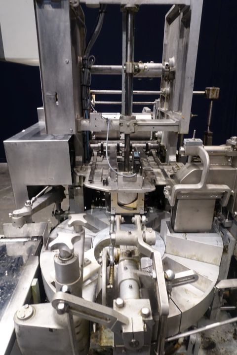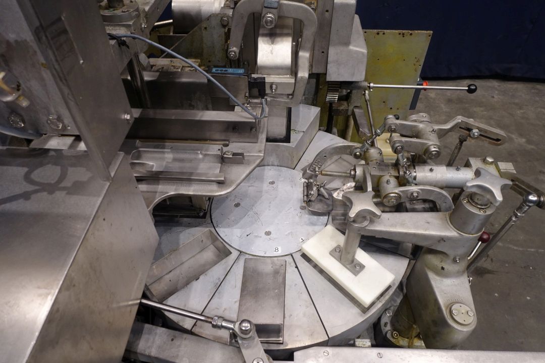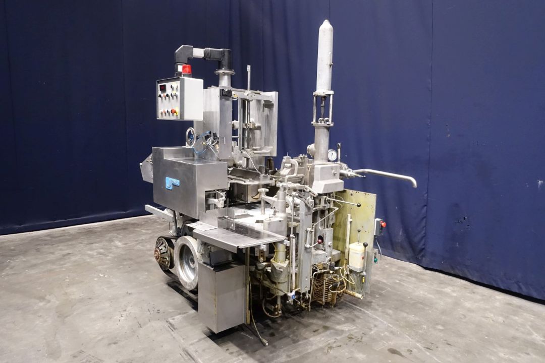 Fully automatic filling and wrapping machine for margarine in aluminium foil or parchment paper. Product feed by direct link up with compensator and return line. Photo cell for print centring device (paper correction by spot mark). Small outfeed conveyor. Format set on this machine: 1.000 gram, 185 x 93 x ± 60 mm. Extra NEW original BENHIL format set available: 500 gram, ± 120 x 80 x 55 mm. Control panel with relay control. Total dimensions: 270 x 180 x 250 cm.