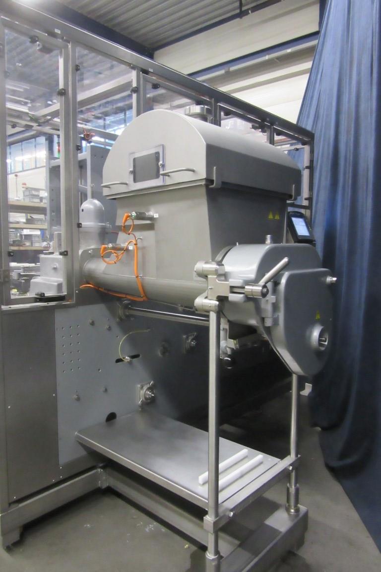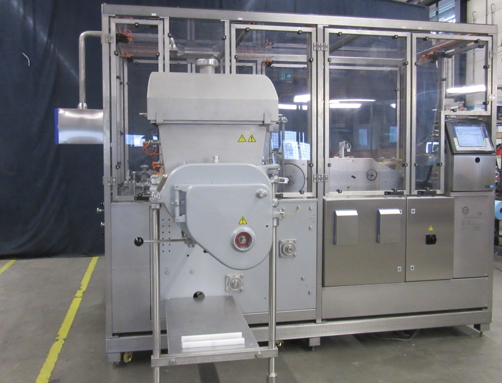 Fully automatic filling and wrapping machine for butter in aluminum foil or parchment paper. Product feed by new trough and augers, made in stainless steel. Machine will only be offered in fully rebuild condition with new controls and current machine safety with CE declaration. Weight range on this model possible: 50 - 500 gram. Current format set on this machine: 250 gram, 100 x 60 x 40 mm (but adjustable to customers wishes). Total dimensions approx: 260 x 140 x 240 cm.
