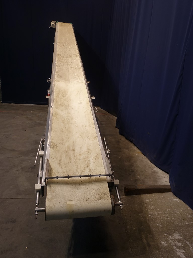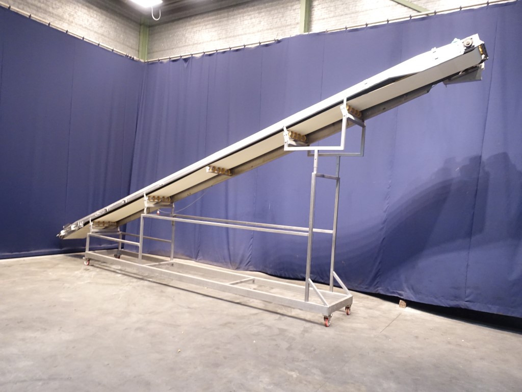 Mobile carry up belt conveyor. Effective belt: 50 x 840 cm. Motor: 0,55 KW - 1375 rpm. 20 degree up. Total dimensions: 800 x 120 x 350 cm.