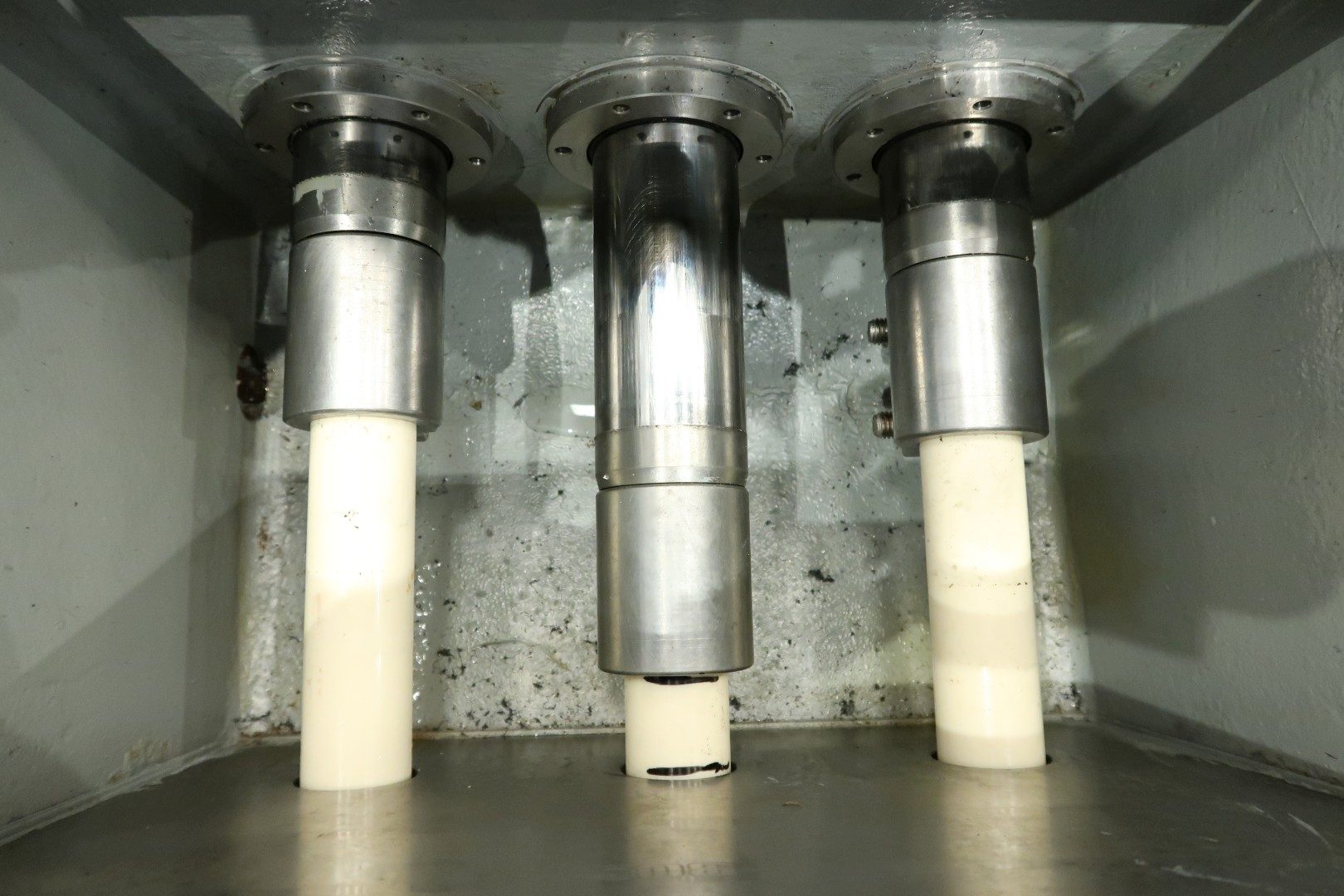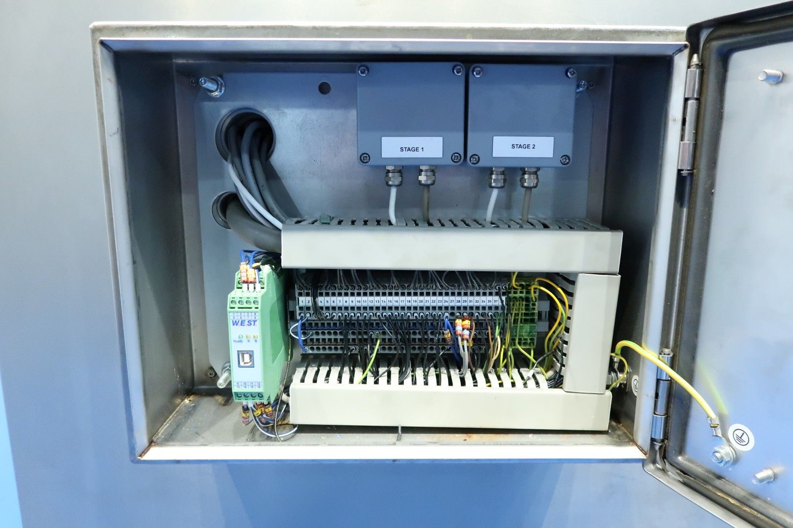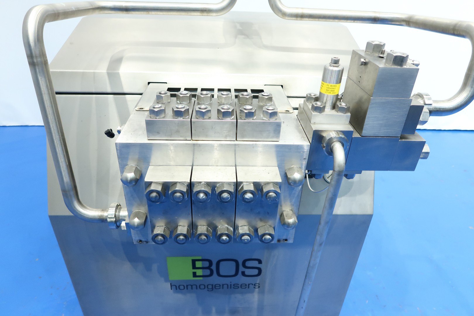 High pressure homogeniser. 2 Stages with hydraulic pressure control. 3 Ceramic Pistons, piston diameter: 32 mm and stroke: 95 mm. Ball valves for viscose products. Connections: (in) 2" Din and (out) 2" Din. Current motor power: 30 kW and maximum pressure in current configuration with this motor up to 400 bar. Freestanding control panel (with Danfoss frequency converter). Set tools. Overpressure valve (480 bar). With Gea bypass valve. Manometer on first and second stage. 2 x Electronic pressure transmitter. Flowswitch on cooling water. Remote pressure control. Documentation available. Total dimensions: 155x115x177 (lxwxh) cm - weight: ca. 1.235 kg.