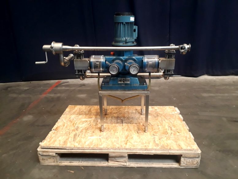 Piston pump, dosing pump to dose 2 ingrediënts simultanious in a set ratio. Stroke adjustable per head. Inbcling infeed and outfeed piping (now combined), Piston diameter 36 mm. Current motor: 1,1 kW - 2.6 A - n1 2850 rpm. Connections: 1'' / 1'' DIN.