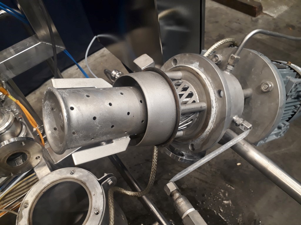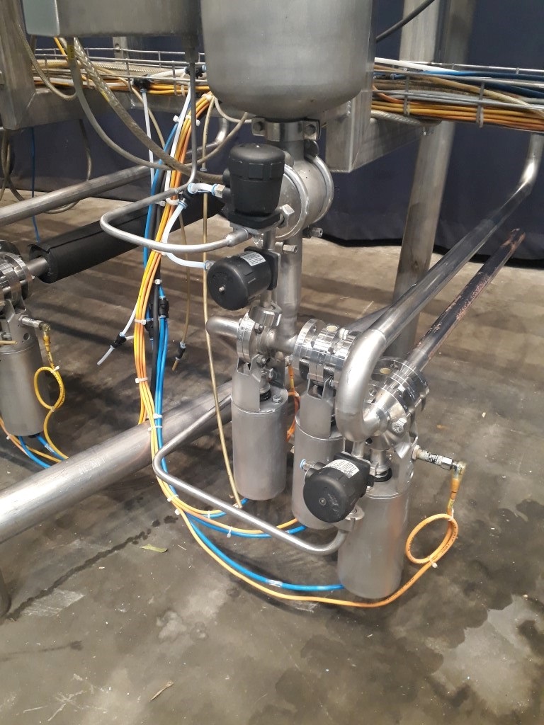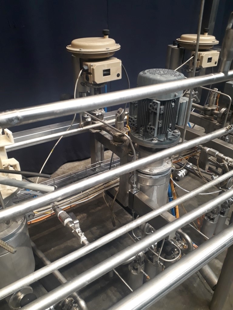 Inline mini fruit mix and foaming machine, Aseptic design. Head dimensions: inner diameter 100 mm and length: 150 mm. Volume: 4 ltr. Single jacketed. Main motor 0,75 kW - 1,93 A - 1418 rpm. Max temp. 100°C. Max pressure 6 bar. Connections for insert of sterile air / nitrogen, flow transmitter for air, pressure transmitter (IFM) on outlet and counter pressure valve (Samson). 4 pieces mounted on 1 frame (STN13482 + STN13483 + STN13484 + STN13485) , can be used as small foaming machine or as a set for a 4 line machine to feed 4 different products. Total dimensions 4p 130 x 310 x 230 cm.