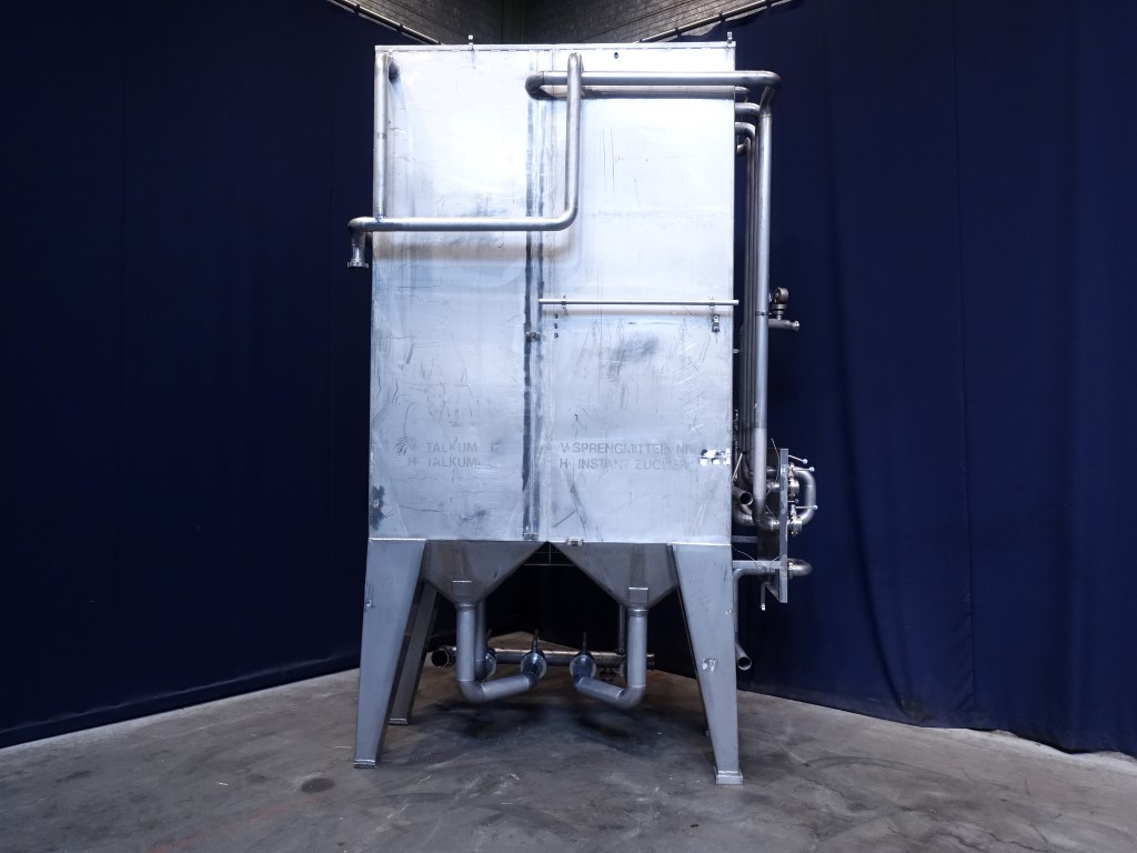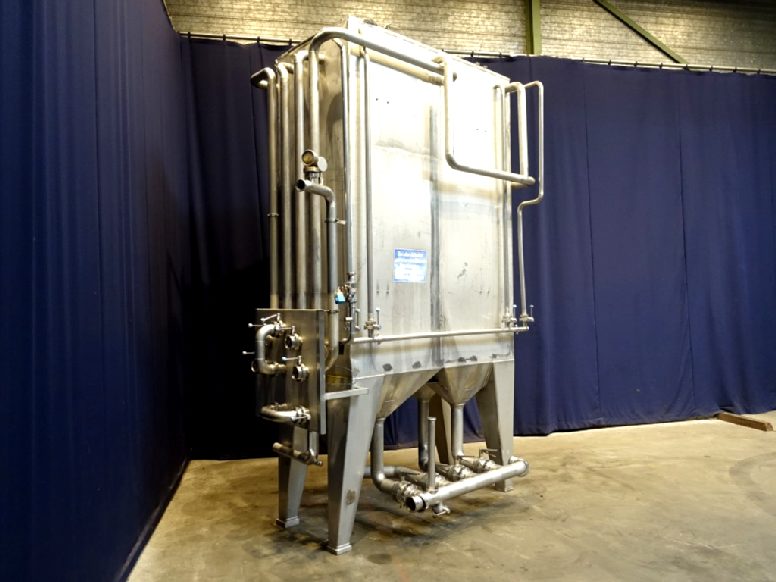 Multichamber vertical, single jacketed tanks (4 pieces of 1.200 ltr/each), No propellor, no cover. CIP water outlet 4x DN100 with manual butterfly valves, flowplate. Dimensions per tank lxwxh: 50x94x250 cm. Total outer dimensions lxwxh: 100x250x370 mm.
