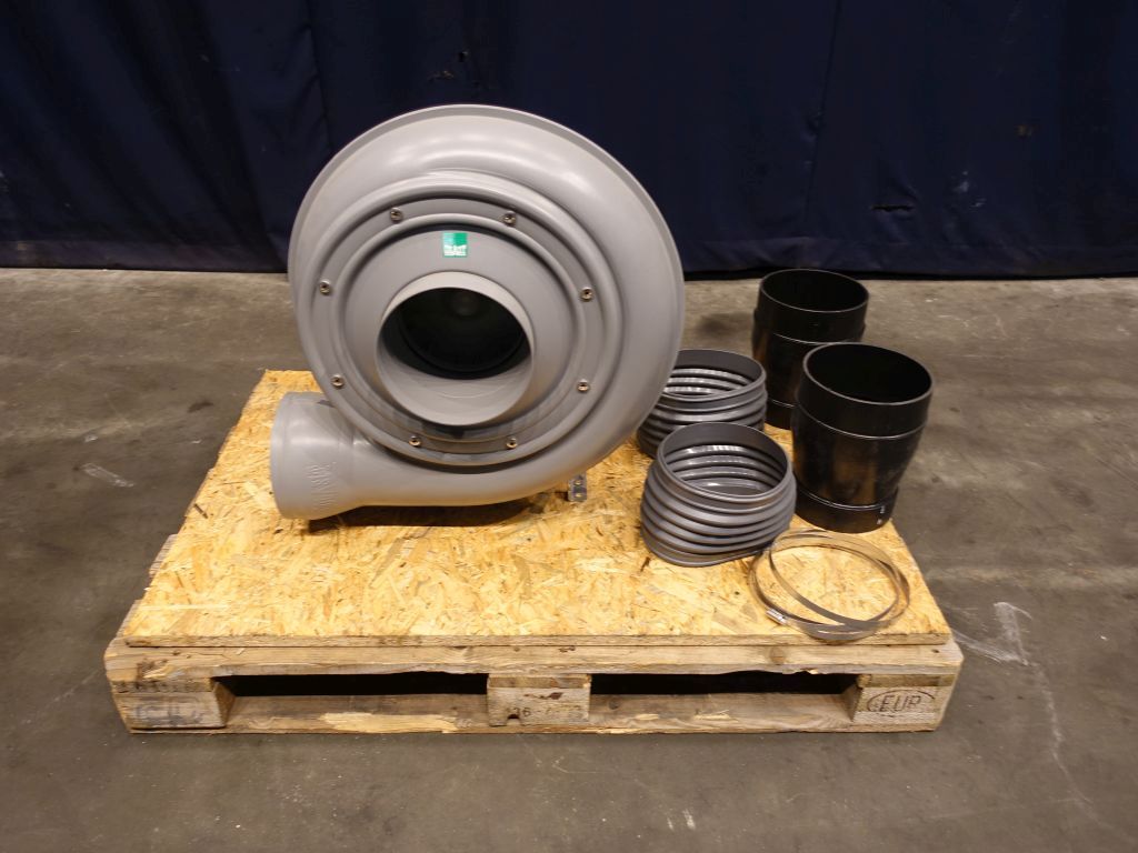New blower. Max 500 m3/hour. Pressure 215 Pa. Speed fan 1407 rpm. Motor power: 0,55 kW - 1,5 A - 1.400 rpm. Temperature max: 80 °C. House and fan: PPs. Connections diameter 200 mm. 2 Reducers to diameter 180 mm. Complete with flexible connection cuff, diameter 200 mm. Total dimensions: 60 x 48 x 68 cm.