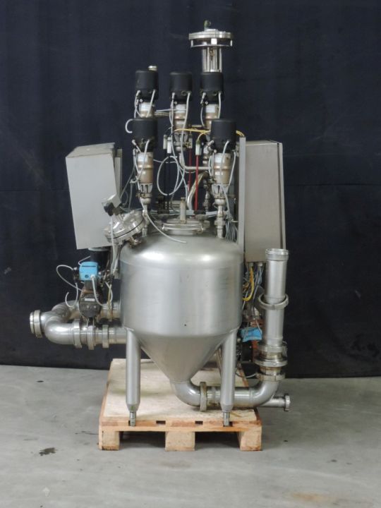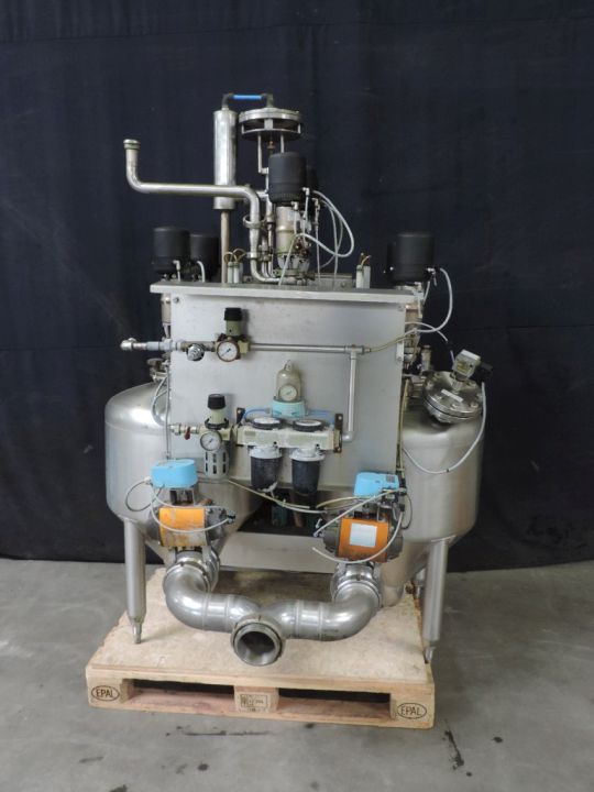 Transport system for liquid products which need extreme gentle treatment of the pumped product. No moving parts touch the product, specially designed for curds of soft cheese. 2x Level tanks. 1x Tank will be filled with curd by vacuum and other tank curd will be emptied with compressed air. This gives a minimum damage to the curd or any other product which cannot resist any shear. Product connections NW100. Working pressure 0,3 bar. Air consumption: ± 800 ltr/min. Control panel with Omron PLC. Dimensions (lxwxh):1,20 x 1,65 x 1,70 mtr. Weight: ca. 450 kg's.