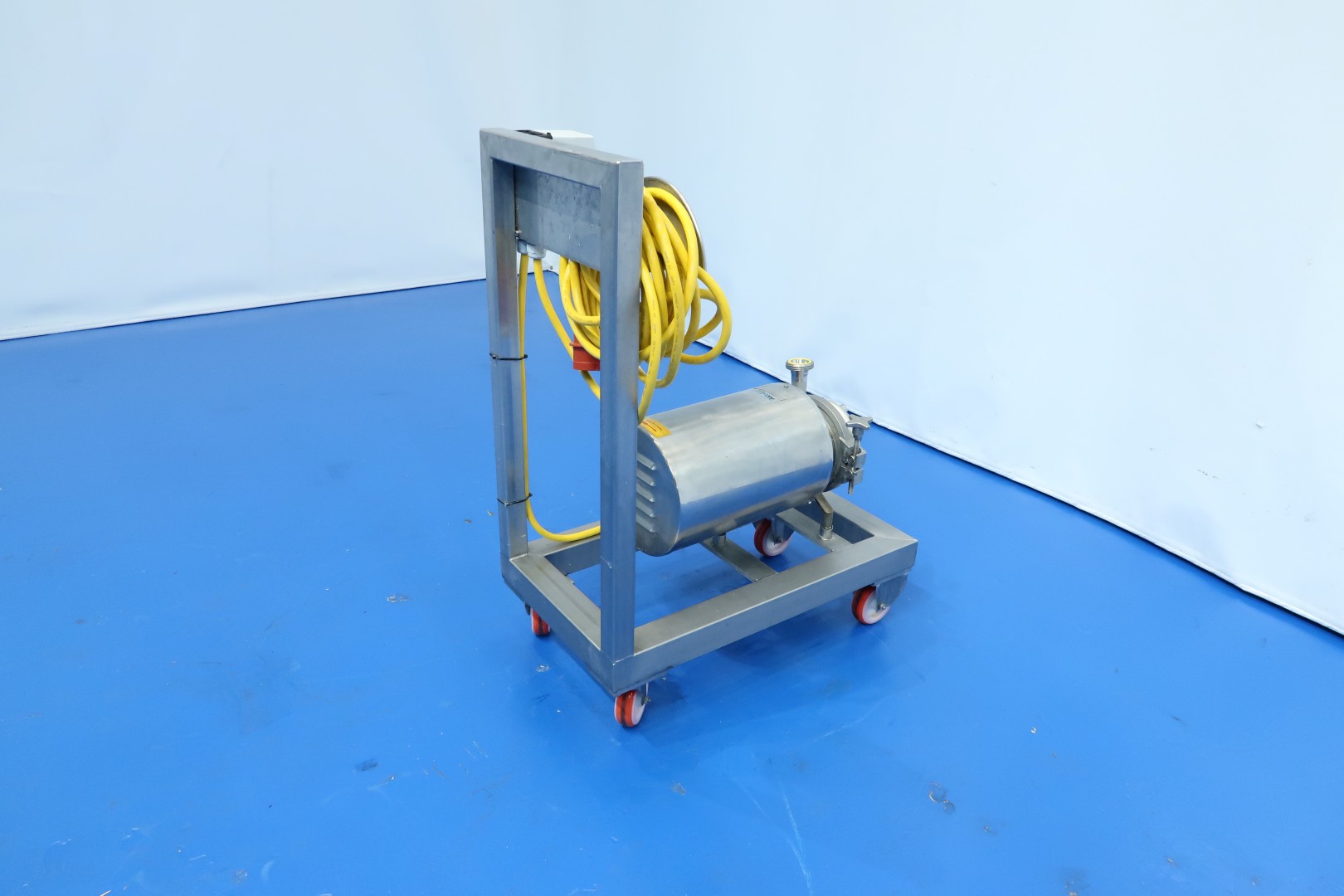 Sanitary centrifugal pump on mobile SS frame with on/of switch. Motor: 1,3 kW - 2,4 A - 2.845 rpm - 50 Hz. Impellor diameter: 145 mm. Pressure: approx 2 bar. Double jacketed head for heating on the head. Connections: (in) 2" SMS / (out) 2" SMS. Total dimensions: 70x40x95 (lxwxh) cm - weight: 47 kg.