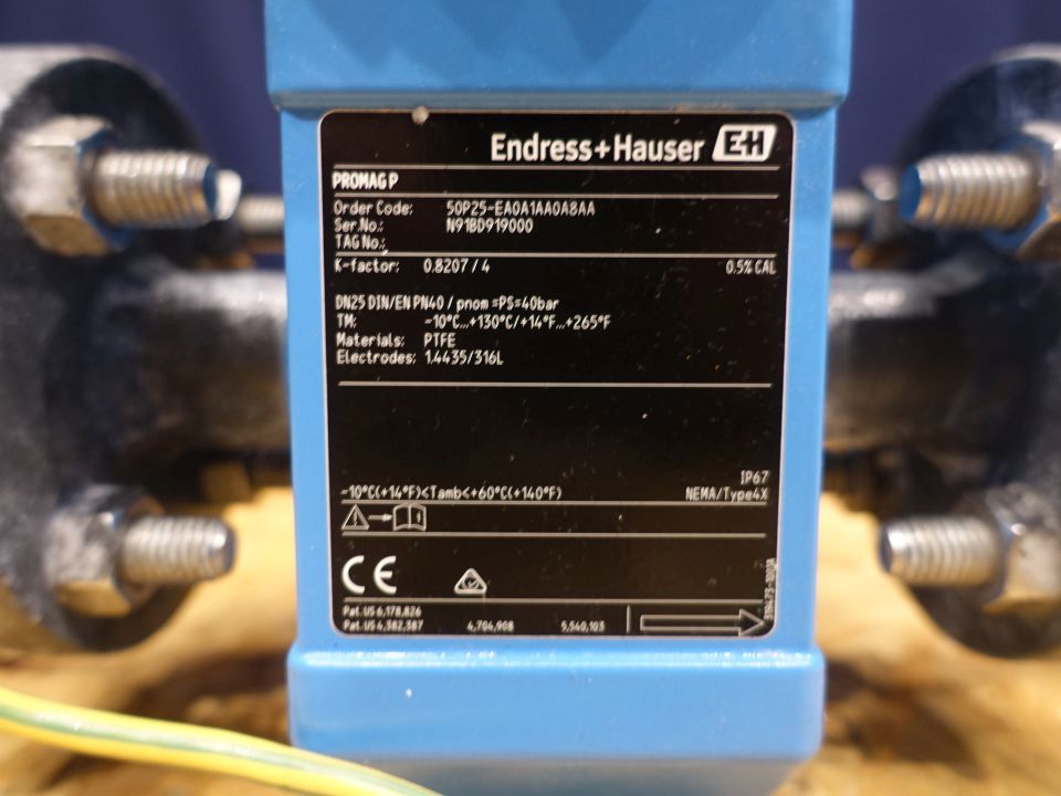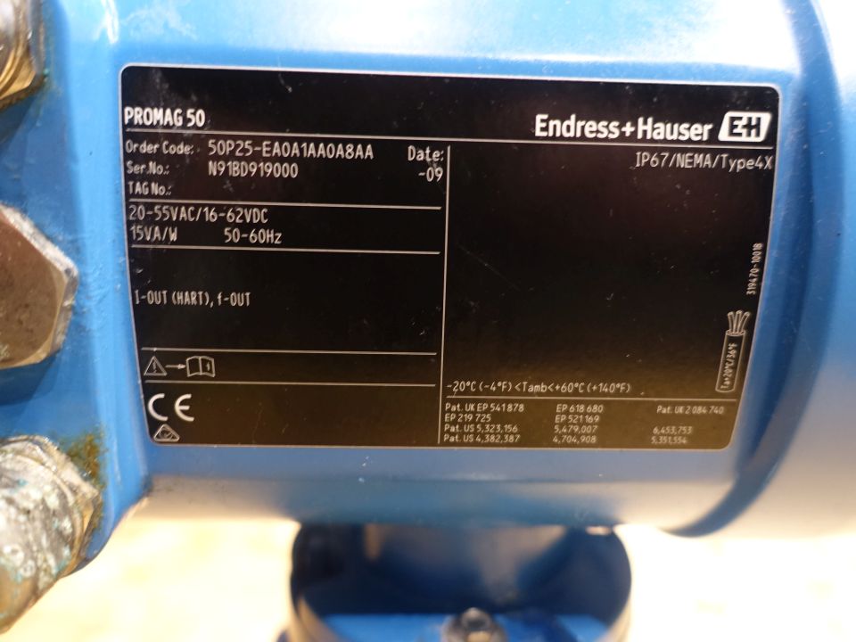 Magnetic flow transmitter. Connections: DN25, flange. Electronic display. Endress + Hauser Promag 50.