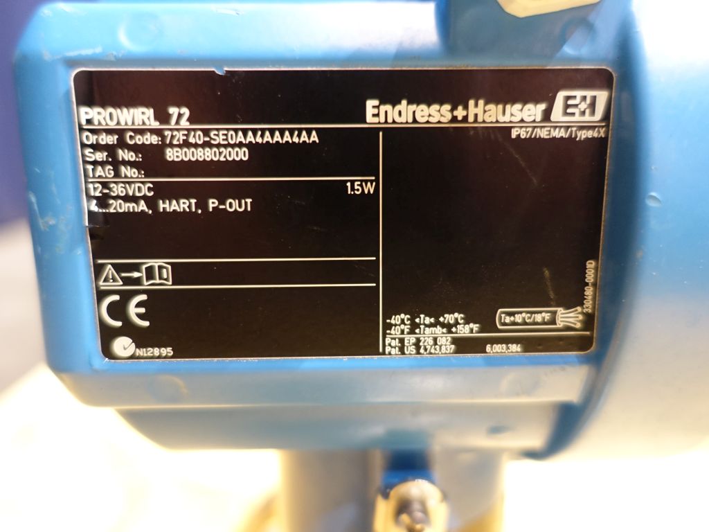 Volume flow meter for measurement of basic liquid / gas /steam applications. Vortex flow measuring system. Connections: DN40 / DN 40, Flange. Electronic head/display Prowirl 72.