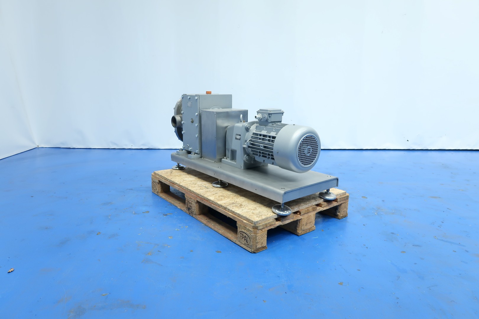 Rotary piston - lobbe - Positive displacement pump with duo stainless steel lobbes. already reconditioned. Diameter lobbes: 160 mm. Displacement per revolution: 0,98 ltr. Nominal capacity 21,3 m3/h. with drive work: motor: 7,5 kW - 14,8 A - n1: 1.445 rpm, i=6,2 - n2: 233 rpm. Design pressure up to 20 bar (300 psi). Mounted on plate with adjustable feet. Connections: (In) 3'' / 3'', SMS. Tested capacity with water (1cp) at 14.000ltr/h without pressure or 3.000ltr/h at 6.4bar pressure Dimensions: 130x45x60 (lxwxh) cm - Weight: 408 kg.