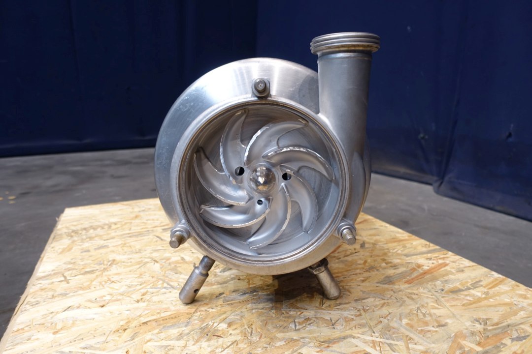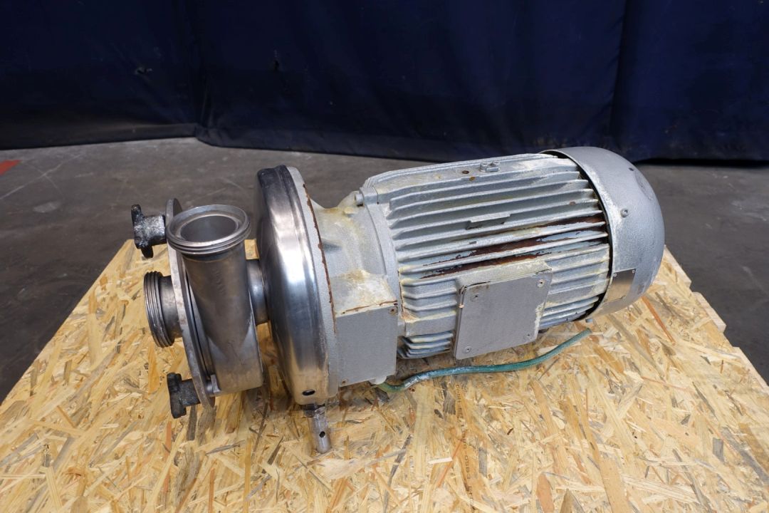 Sanitary centrifugal pump. Current motor: 7,5 kW - 13,5 A - 2.900 rpm. Impellor diameter: 165 mm. Connections: (in) 3" Din / (out) 2,5" Din. Dimensions: 72x30x37 (lxwxh) cm, weight: 146 kg. Slight damage on impellor