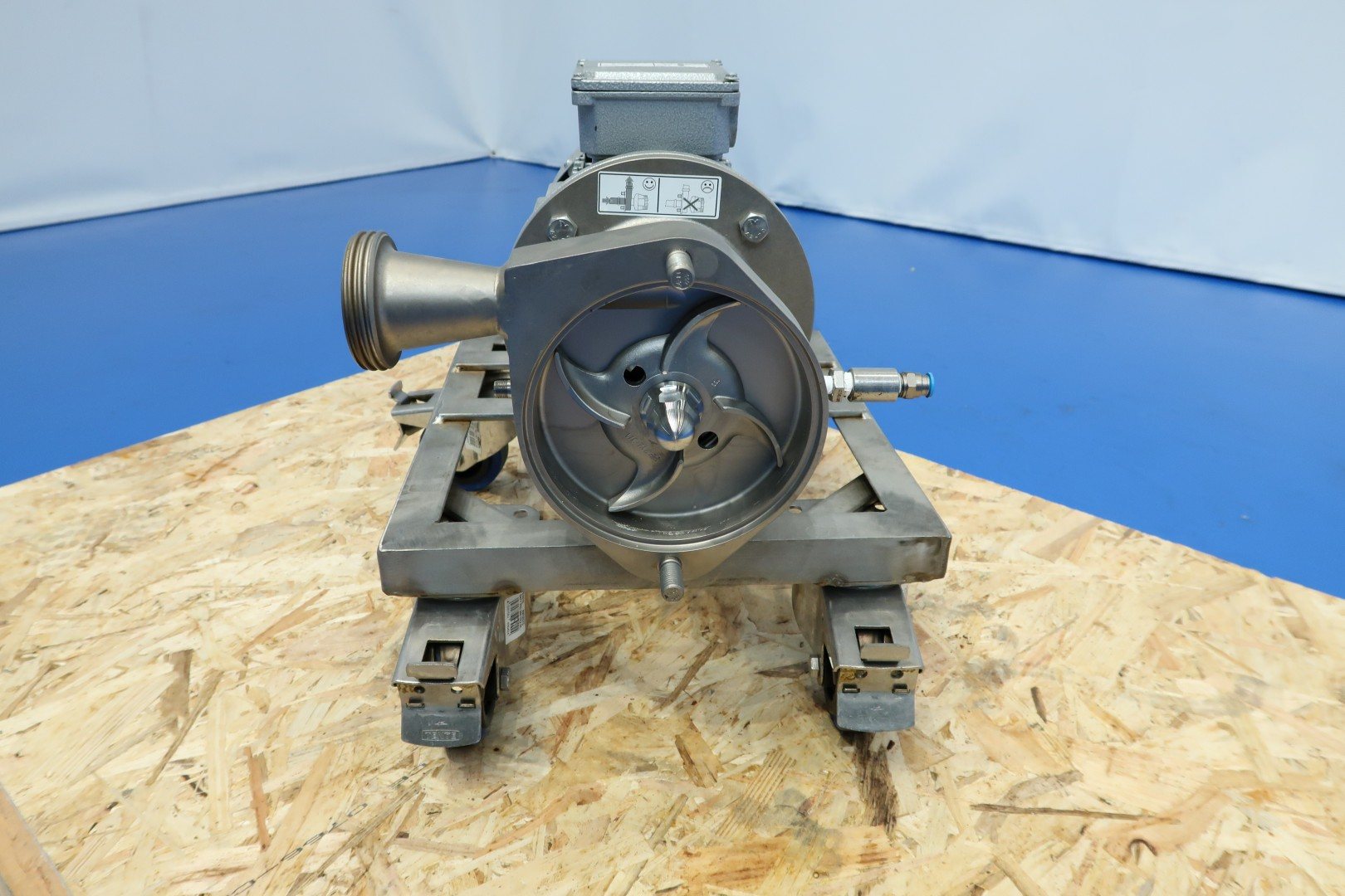 Sanitary centrifugal pump on mobile SS frame. Motor: 1,5 kW - 3,15 A - 2.900 rpm. Impellor diameter: 130 mm. Pressure: 1,7 bar. Flushed seal. Connections: (in) 2" Din / (out) 2" Din. Total dimensions: 50x33x38 (lxwxh) cm -weight: 40 kg.