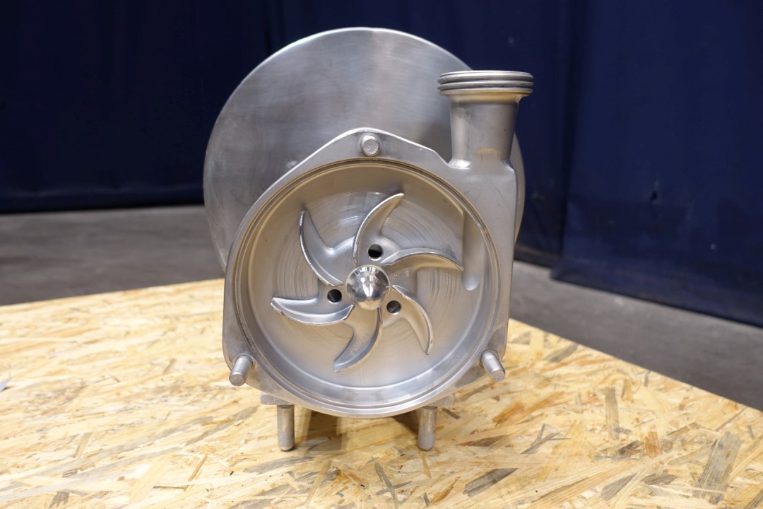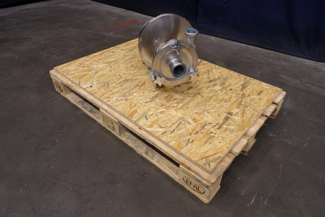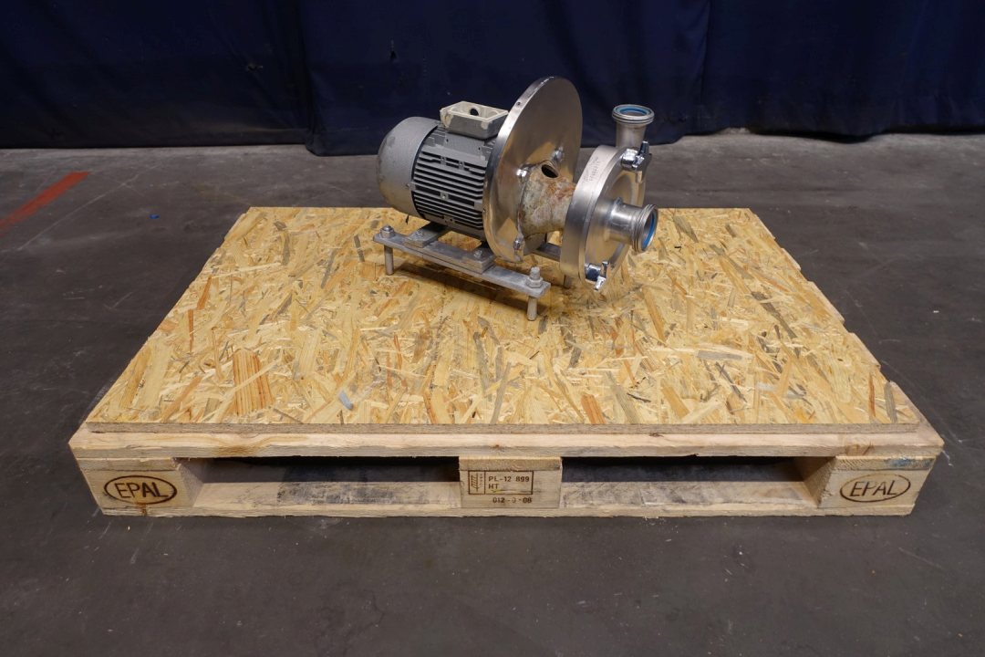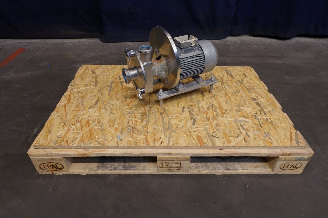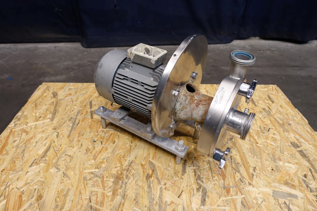 Sanitary centrifugal pump. Current motor: 2,2 kW - 4,7 A - 2.850 rpm. Impellor diameter: 145 mm. 10,000ltr at 2,9bar or 15,0000ltr at 2,7bar Connections: (in) 2'' Din / (out) 1,5" Din. Dimensions: 50x30x39 (lxwxh) cm, weight: 66 kg's.
