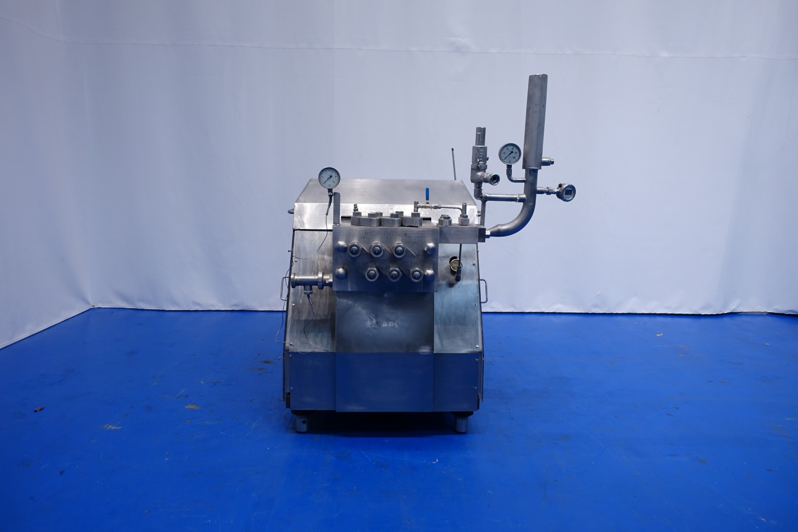 High pressure homogeniser. 1 stage with manual pressure control. 3 Pistons, piston diameter: (1-15/16') 50 mm. Connections: 2 Din. Current motor power: 30 KW - 57 A - 1.465 rpm - 50 Hz and maximum pressure in current confirguration with this motor 250 bar. With overpressure valve. Manometer on in and outlet. With electronic pressure transmitter. Flowswitch on cooling water. Total dimensions: 165x148x182 (lxwxh) cm - weight: 2.300 kg.