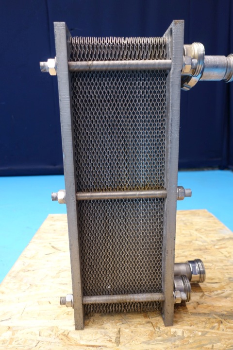 Plate heat exchanger, sanitary (PHE). Max working pressure: 6 bar. Beam length: 165 cm, connections: 4x2" Din. Current configuration: 1 Section: 50 plates. Connections follower: 2 up/2 down. Dimensions: 38x17,5x57 cm - weight: 49 kg.