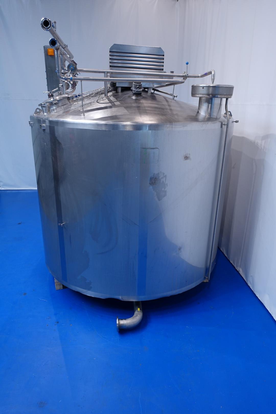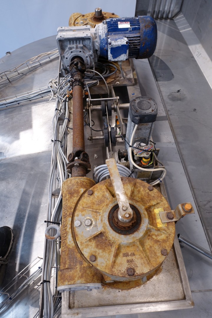 Horizontal curd making vat. Double-O DB. Double jacketed. Whey suction device from the top with sensors. Manhole round 45 cm with safety guard with sensor. Higher placed legs (currently cut for transport). Drive motor 4,0 kW. CIP cleanable, equipped with two spray bowls. Breather on top with cip bowl, cip pipe with manual butterfly valve. Inspection lamp in top. Outlet (cheese curd) height (with legs) ca 35 cm, pipe diameter ca. 100mm. New controls and auxilieries can be offered on request. Operation manual and electrical diagram (in German) available. Total dimensions: 395x260x335 (lxwxh) cm - weight: 2.870 kg
