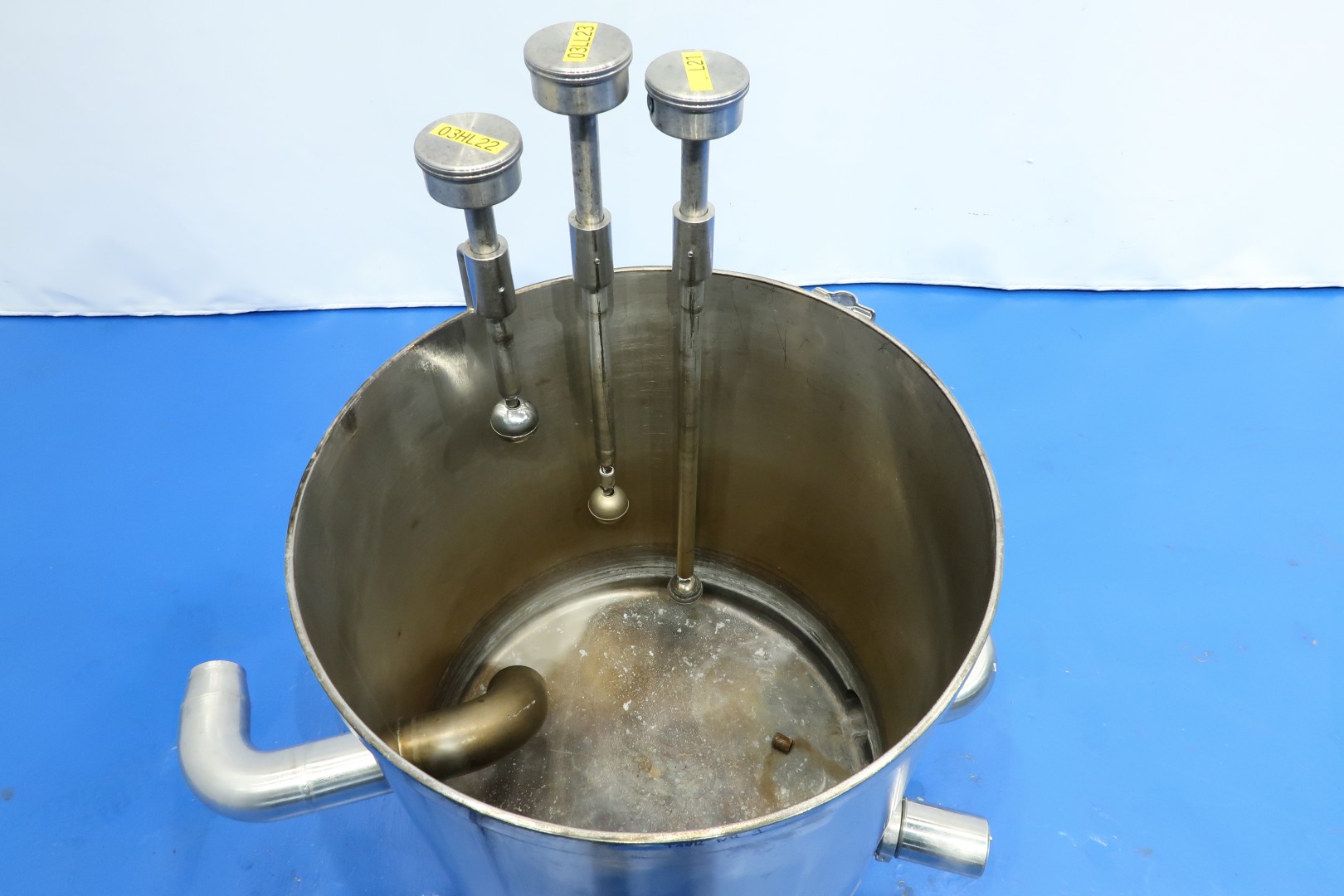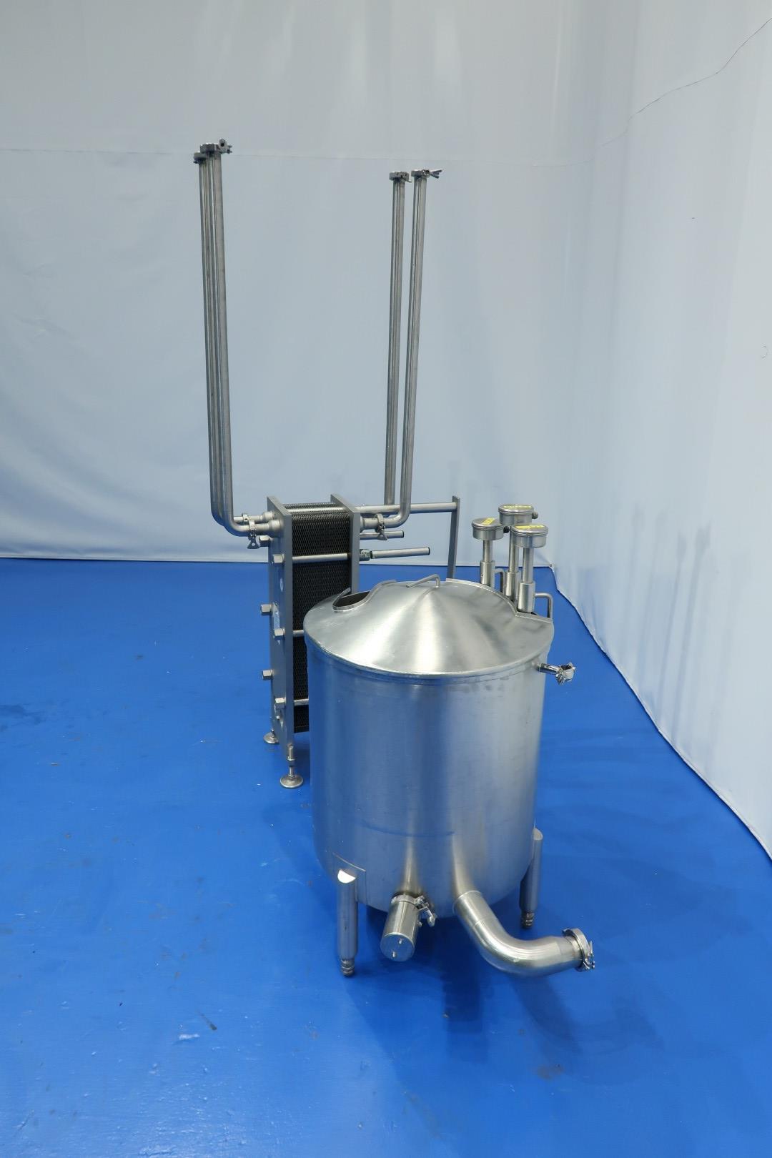 Plate heat exchanger, sanitary (PHE). Max working pressure: 6 bar - max working temperature: 100 ­°C. Beam length: 62 cm, connections: 4x 1,5" Tryclamp. Current configuration: 1 Sections: 61 plates - Connections head: 2 up, follower 2 up. Originally used as cream cooler ± 55 -> 4°C at 1,500ltr/h but can also be used for other liquid products with different flow/temperatures capacity approx 75kW. With balance vessel (ca. 160 ltr.) with level sensors, valves and piping.
