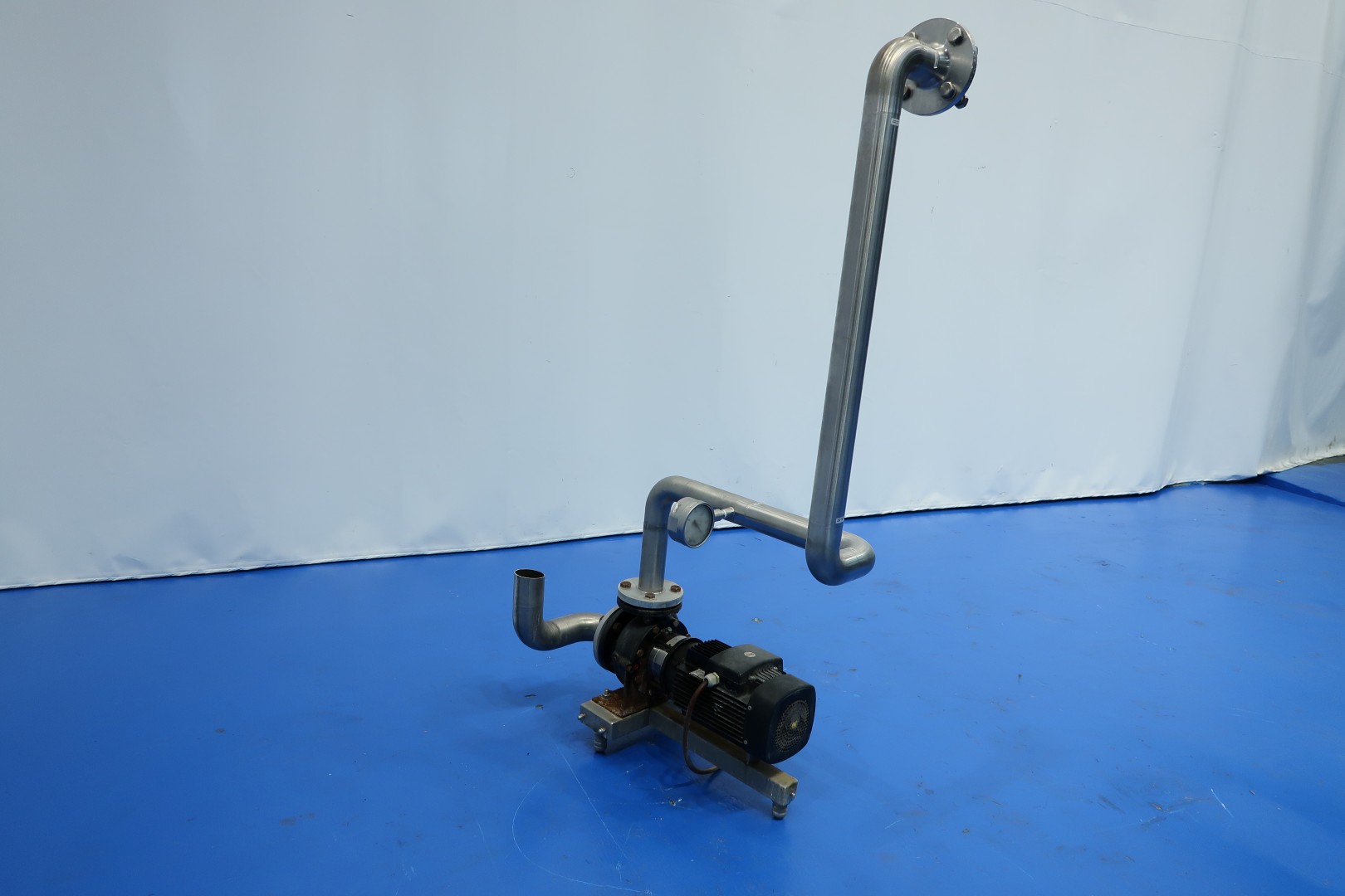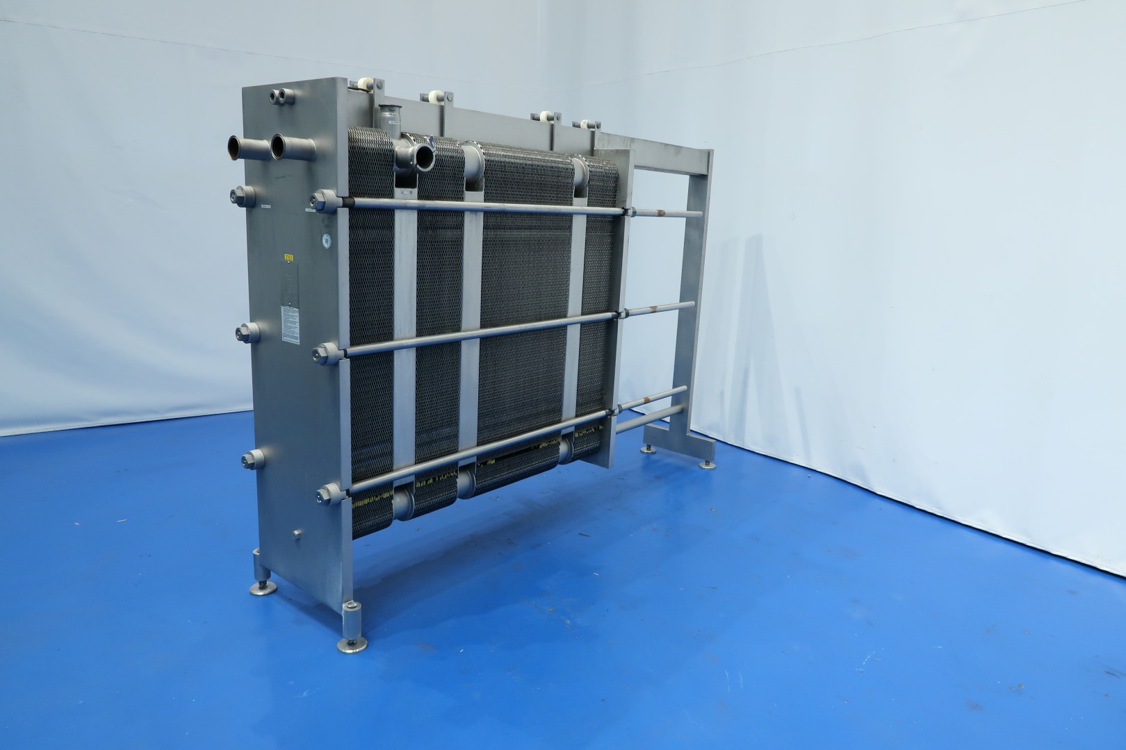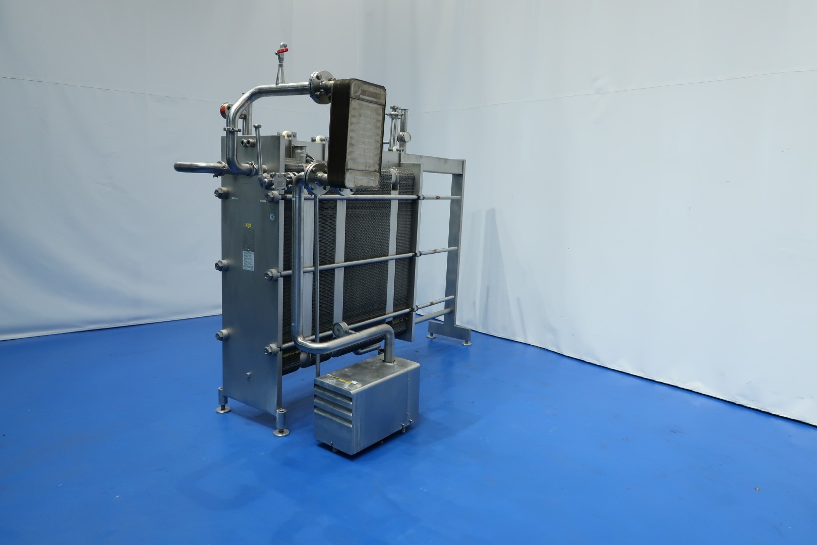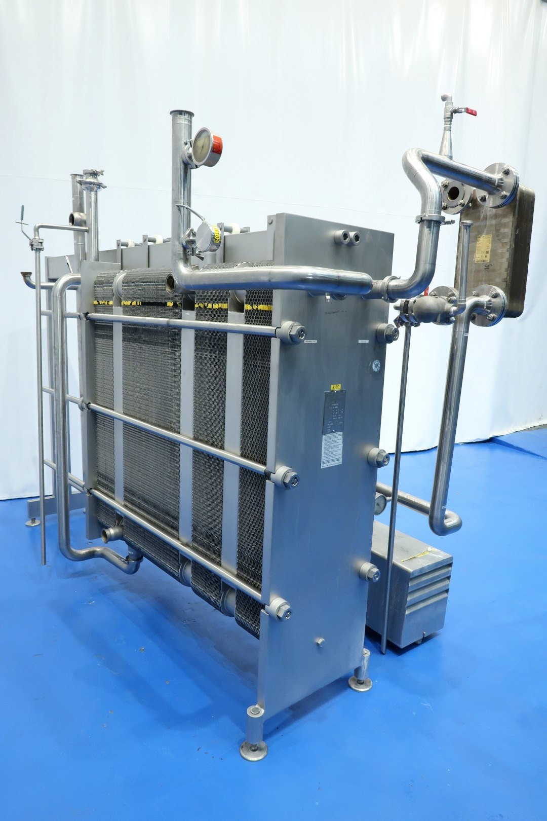 Milk pasteuriser unit, with Plate heat exchanger (PHE). Max pressure: 8 bar - max temperature: 130 °C. Beam length: 254 cm, connections: 10 x 2,5" Tryclamp. Current configuration 4 Sections: regeneration (2x), heating and cooling. temperature cycle: ± 4-55 (outlet to separator) - 75 - 4°C, 49-49-121-49 plates (total 268) - Connections head: 2 up, follower 2 down. With 1 x matching ringkey. Hotwater circulation pump (Grundfos NP 65-50-125) and Kelvion brazed hetatexchanger steam/hotwater (GBS 700L-60), part of piping and sensors. Dimensions PHE: 275x62x187 (lxwxh) - weight: 3.505 kg.