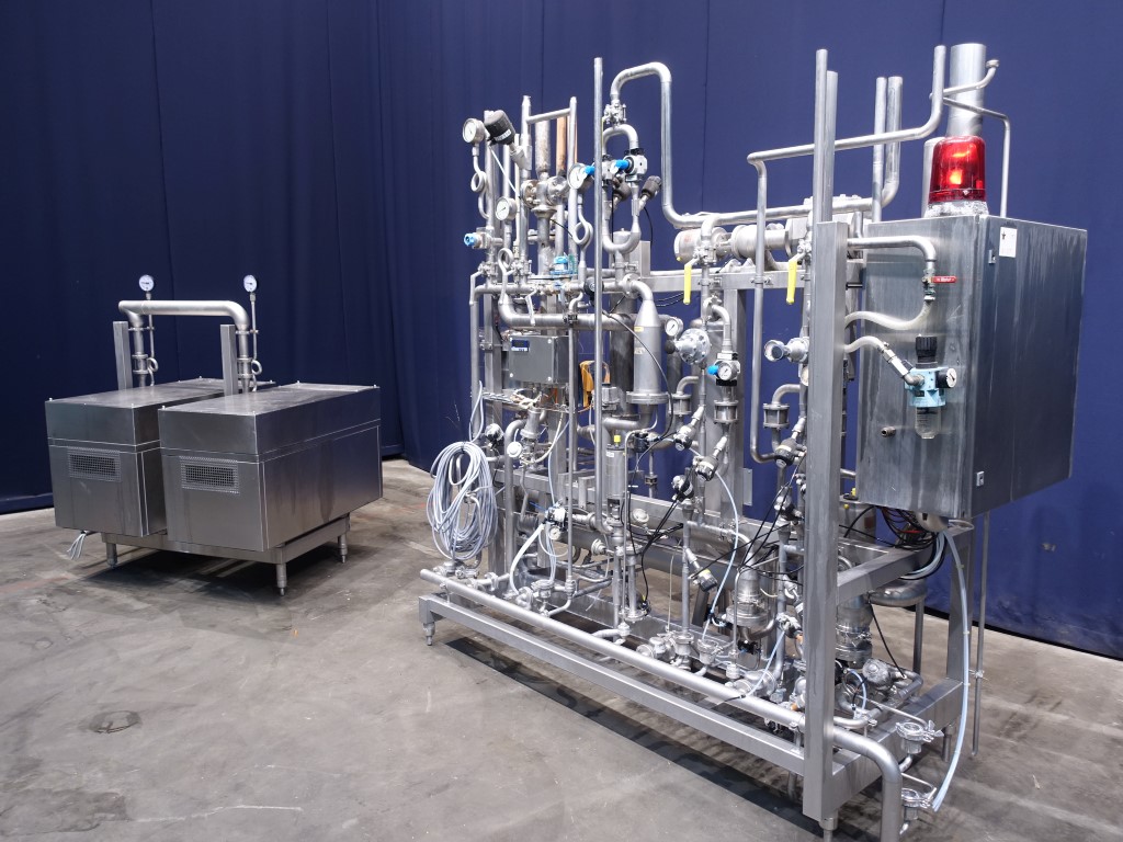 Sterile air treatment system. Originally used on a aseptic machine can be used to blow sterile air of which the temperature can be controlled for instance for filling machines or set of tanks. The unit is existing out of frame with 2 blowers (Wittig DST 140, 112 m3/h, 7,5 kW each) placed in a sound proof box. A separate skid with a stainless steel filter (steamable), injection of peroxide and desinfectant by dosing pump into the air and tubular heat exchanger for cooling the air with ice water. Including all interconnecting piping and valves, controls (Siemens S5 PLC, to be replaced). Total outside dimensions: 1,3 x 2,7 x 2,5 and 1,3 x 1,3 x 1,8 mtr.