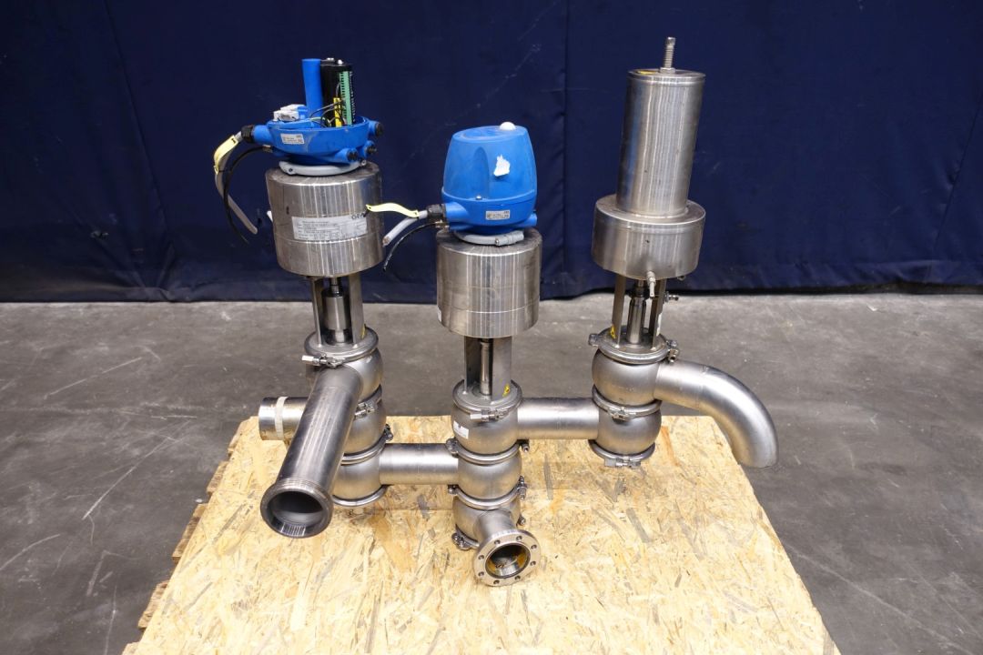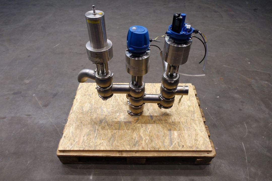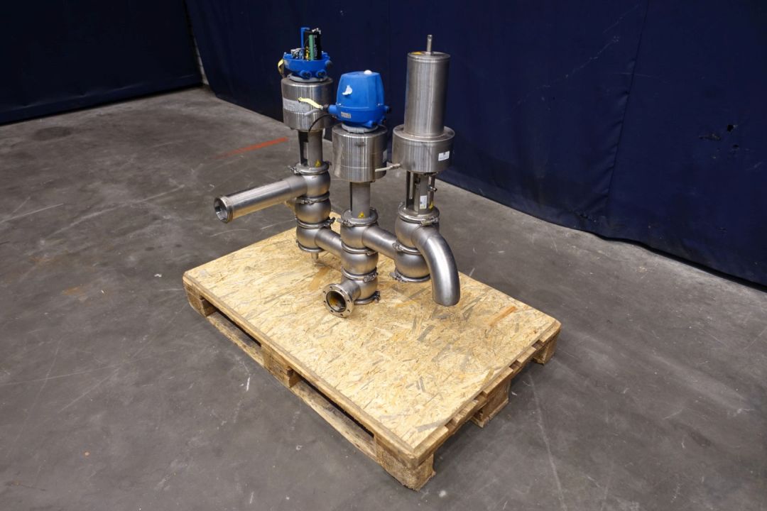 Gea valve manifold-cluster. 2 x valve with 3 outputs and 1 x valve with 2 outputs. Pneumatic activated 2-3 way. Connections 1 x 3" SMS, 1 x 3" Flange, 1 x 3" pipe. Min pressure 6,0 bar - Max pressure 8,0 bar. Dimensions: 90 x 45 x 90 cm. Weigth ca. 60 kg.