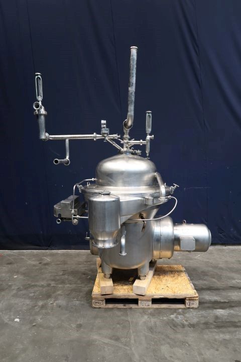 Separator, skimmer for milk or whey. Self cleaning. Including: bowl (bowl speed: 4.500 rpm), motor (18,5 kW - 1460 rpm), motor cover, cyclone, pressure indicator and manual counter pressure valve skim milk, flowindicator and manual flow regulation valve for cream, remix valve for cream, flowindicator incoming milk and manouvering water valves. Tools for maintenance with ring key. Excluding: base frame and controls.
