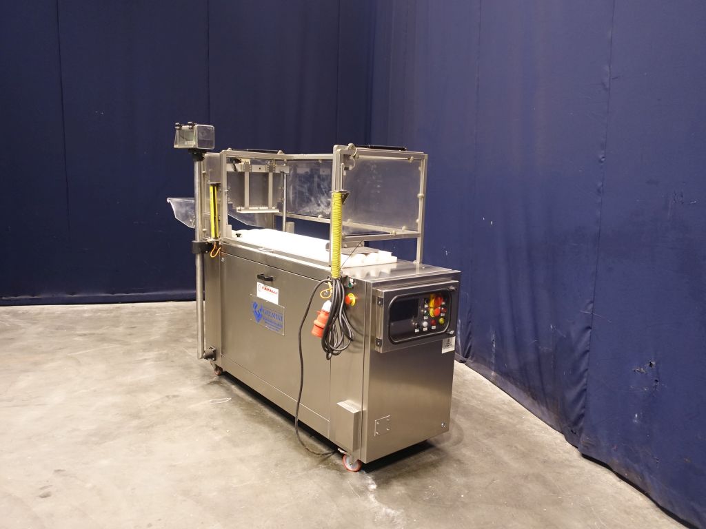Automatic portioning machine. Productivity and precision in cutting chunks of cheese with different sizes and densities. Automatic machine accomplished for the cut in chunks of cold cuts (speck, raw and cooked ham, ciccioli, bacon, tenerone, and so forth) and cheeses (provolone, pancettoni, and so forth). Cutting roud sausages into pre-set length. Cutting 3 pieces at the same time. Manual infeed of the sausage. Max length of the sausage: 100 cm. Max diameter of the sausage: 95 mm. Sick protection system by infeed. Mobile. Total dimensions: 290 x 80 x 180 cm.