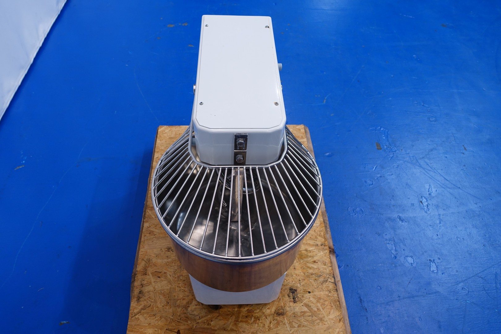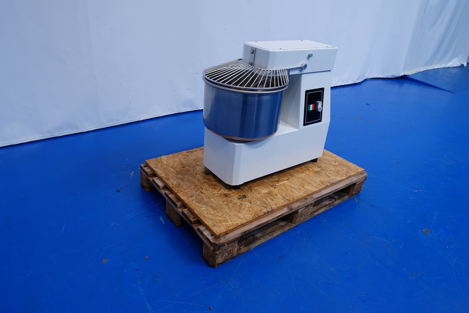 Dough kneading machine with fixed SS bowl. In working condition. Max content 18 kg flower or 22 liters. With safety sensor on top fence. Dimensions: 79x43x72 (lxwxh) cm - 130 kg.