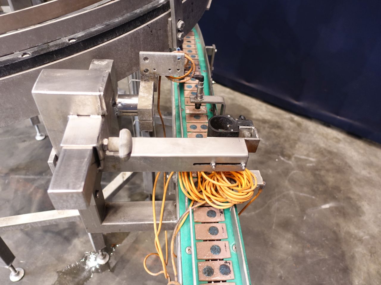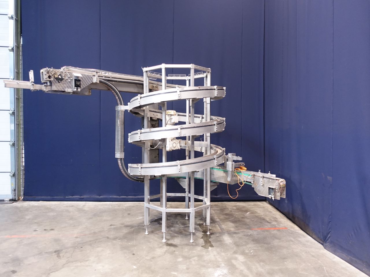 Upgoing spiral chain conveyor. Upgoing from: 93 cm to 230 cm. Effective Belt: width: 8 cm. Motor: 0,55 KW - 1410 rpm. Total Dimensions: 240 x 320 x 250 cm. Has been running together with STN14385, 14386, 14388.